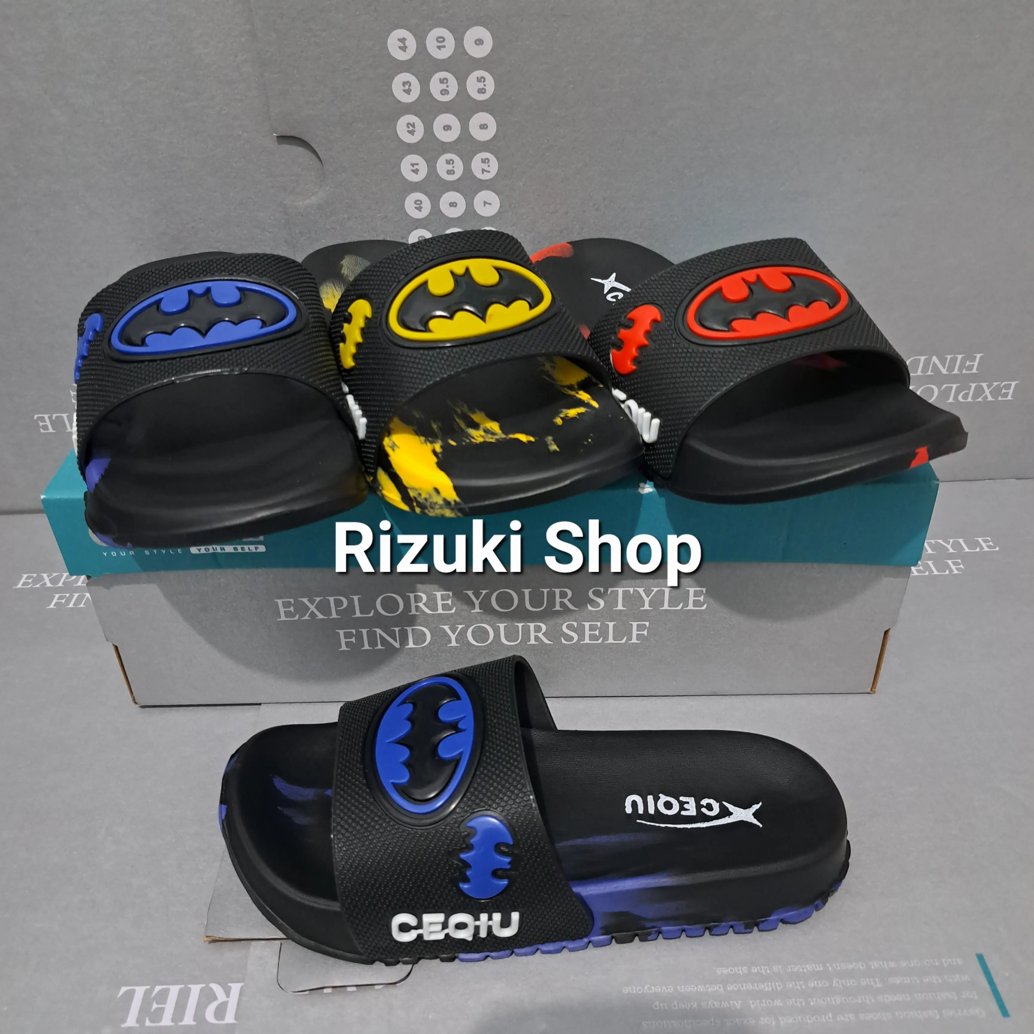 Tersedia tiga warna, hitam kuning, hitam biru dan hitam merah.