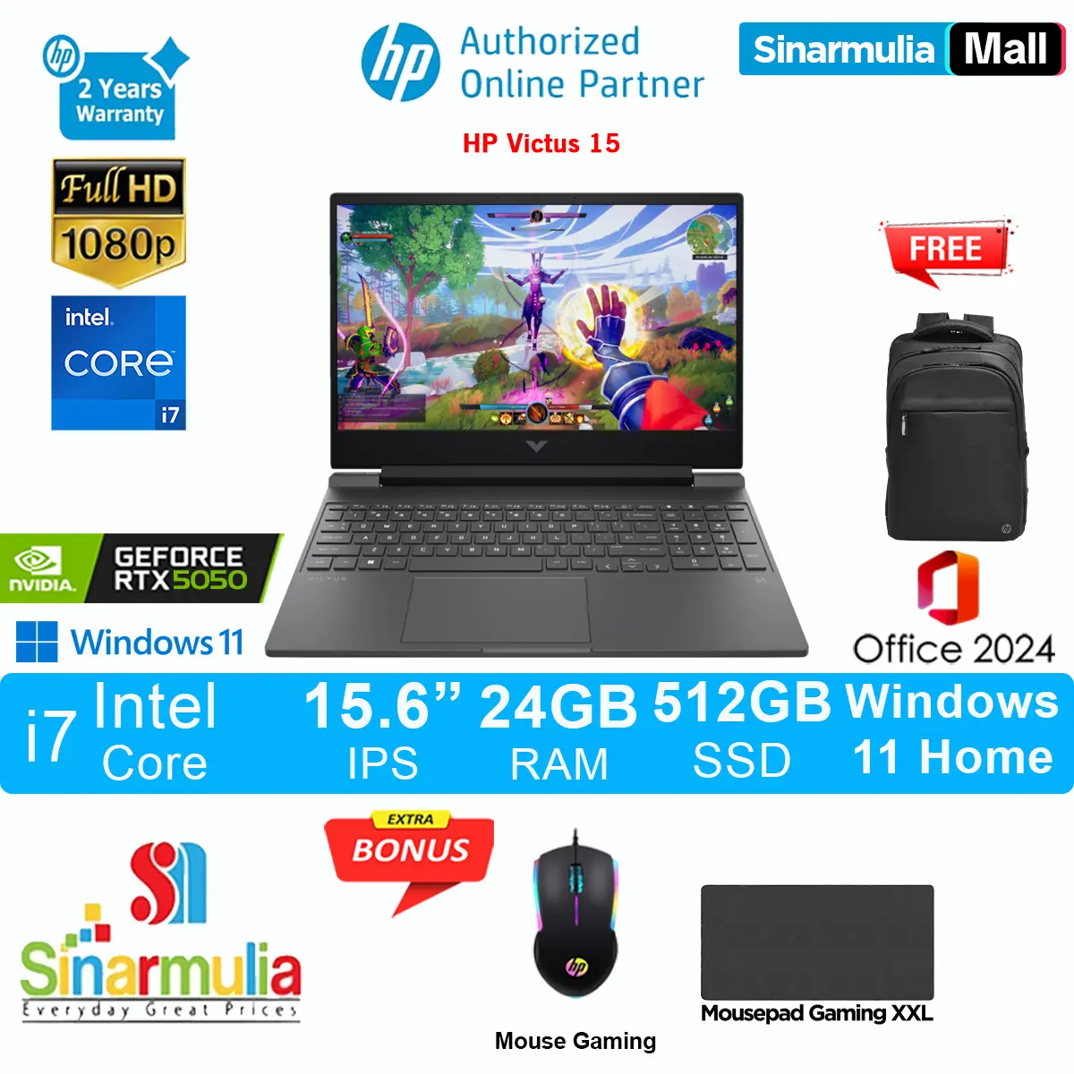 HP Victus Gaming 15 i7-13620H RTX5050 512GB SSD 24GB IPS 144Hz Win11+OHS - fa2785TX