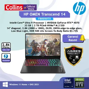 HP OMEN Transcend 14-FB0050TX - Ceramic White HP OMEN Transcend 14-FB0052TX - Shadow Black • Processor : Intel Core Ultra 9 Processor 185H 2.3 GHz (24MB Cache, up to 5.1 GHz, 16 cores, 22 Threads); Intel AI Boost NPU • Graphics : NVIDIA GeForce RTX 4070 Laptop GPU 8 GB • Memory : 32 GB • Chipset : Intel integrated SoC • Storage : 2 TB PCIe NVMe M.2 SSD (4x4 SSD) • Display : 14" diagonal, 2.8K (2880 x 1800), OLED, UWVA, edge-to-edge glass, Low Blue Light, HDR 500 nits Screen-To-Body Ratio 83.73% • Webcam : HP True Vision 1080p FHD IR camera with temporal noise reduction and integrated dual array digital microphones • Operating system : Windows 11 Home • Audio Features : DTS:X Ultra; Dual speakers; HP Audio Boost; HyperX • Color : Shadow Black Ceramic White • Keyboard : Full-size, 4-zone RGB backlit • Pointing device : Precision Touchpad support • I/O Ports : 1 USB Type-A 10Gbps signaling rate (HP Sleep and Charge); 1 USB Type-A 10Gbps signaling rate; 1 HDMI 2.1; 1 headphone/microphone combo; 1 Thunderbolt 4 with USB Type-C 40Gbps signaling rate (USB Power Delivery, DisplayPort 2.1, HP Sleep and Charge); 1 USB Type-C 10Gbps signaling rate (USB Power Delivery, DisplayPort 1.4a, HP Sleep and Charge) • Wireless : Intel Wi-Fi 6E AX211 (2x2) and Bluetooth 5.3 wireless card • Battery : 6-cell, 71 Wh Li-ion polymer • Power supply : 140 W USB Type-C power adapter • Office software : Microsoft Office 2021 Home and Student • Dimensions (W X D X H) : 12.32 x 9.19 x 0.67 in (front); 12.32 x 9.19 x 0.71 in (rear) Garansi Resmi HP Indonesia 2 Tahun + ADP
