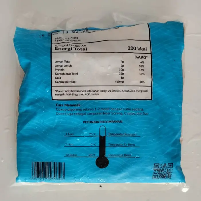 TEMPURA ILM Ikan Olahan Netto : 500gram Komposisi : Ikan (65%), Tepung Tapioka, Bengkuang, Wortel, Gula, Garam, Bawang Putih, Penguat Rasa Mononatrium Glutamat, Ketumbar, Minyak Wijen. Simpan pada suh beku -20 derajat celcius. BPOM RI MD 243213005434 Diproduksi oleh : PT. INDO LAUTAN TIMUR Sidoarjo 61261 - Indonesia Ready stock... Silakan diorder... Kepuasan pelanggan adalah tujuan kami...