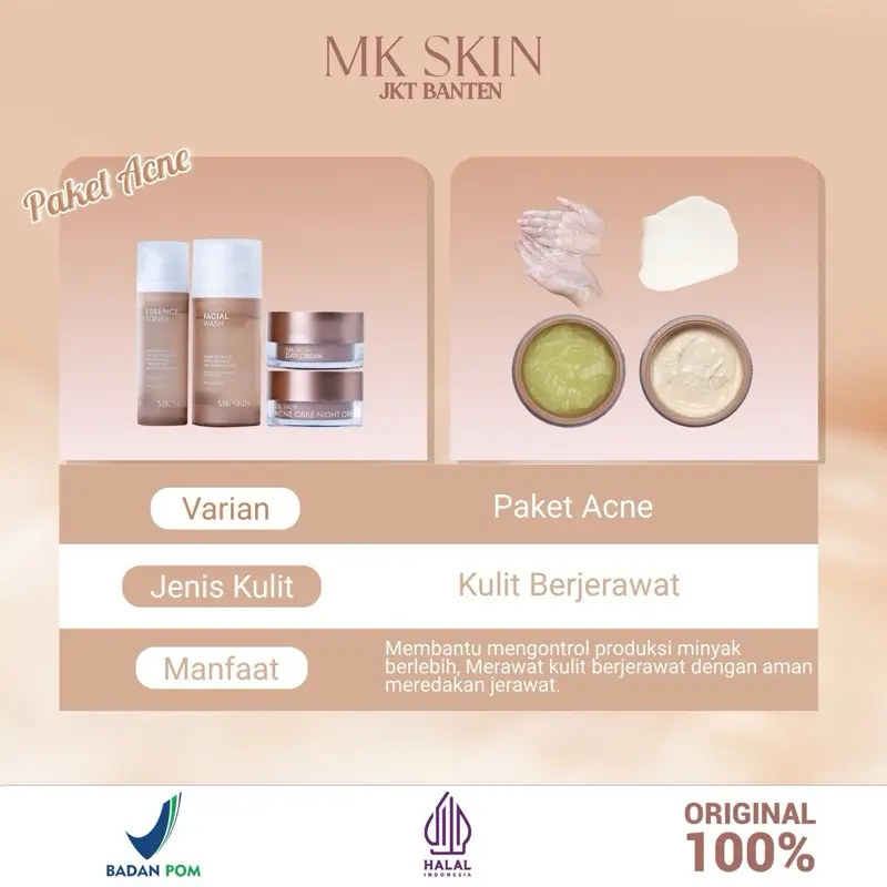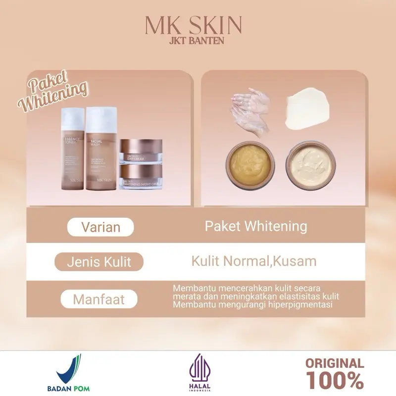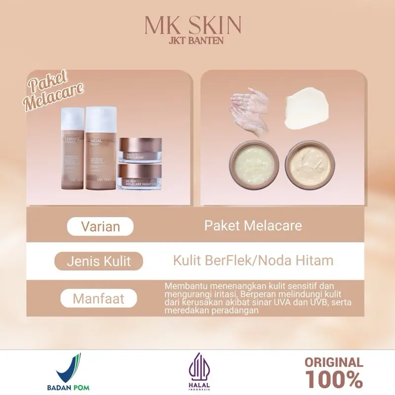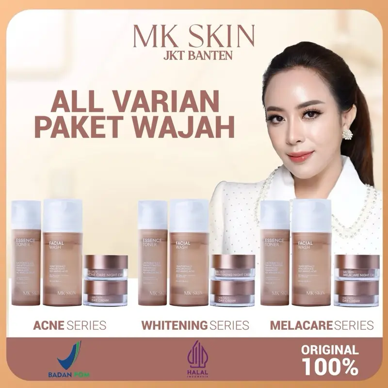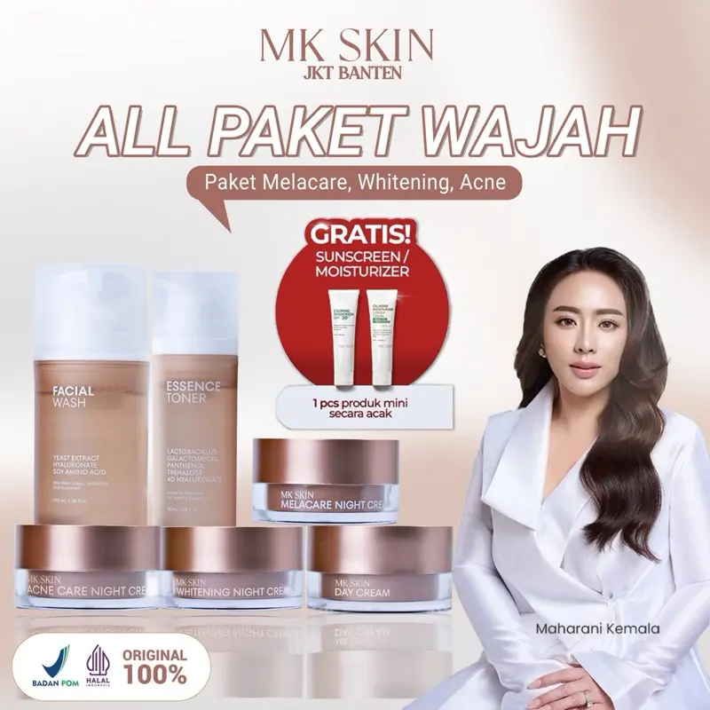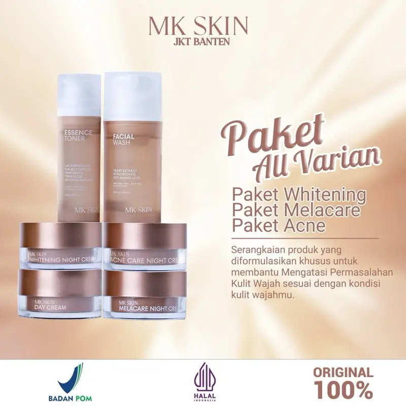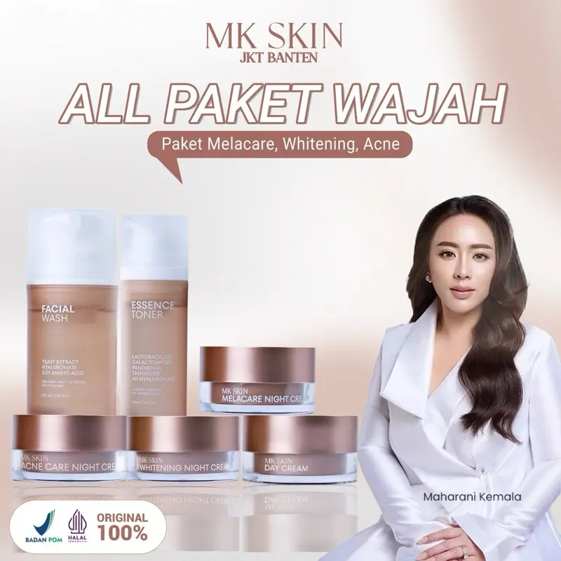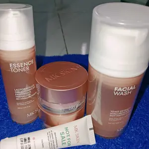 Mantap banget MK skin.stelah gonta ganti scincare cuma ini yg cocok dimuka aku.baru abis 1 paket udh kliatan cerah glowing rata bngt .skrng pembelian ke 2x aku .btw cream malam sm toner emg cpt abis bngt..