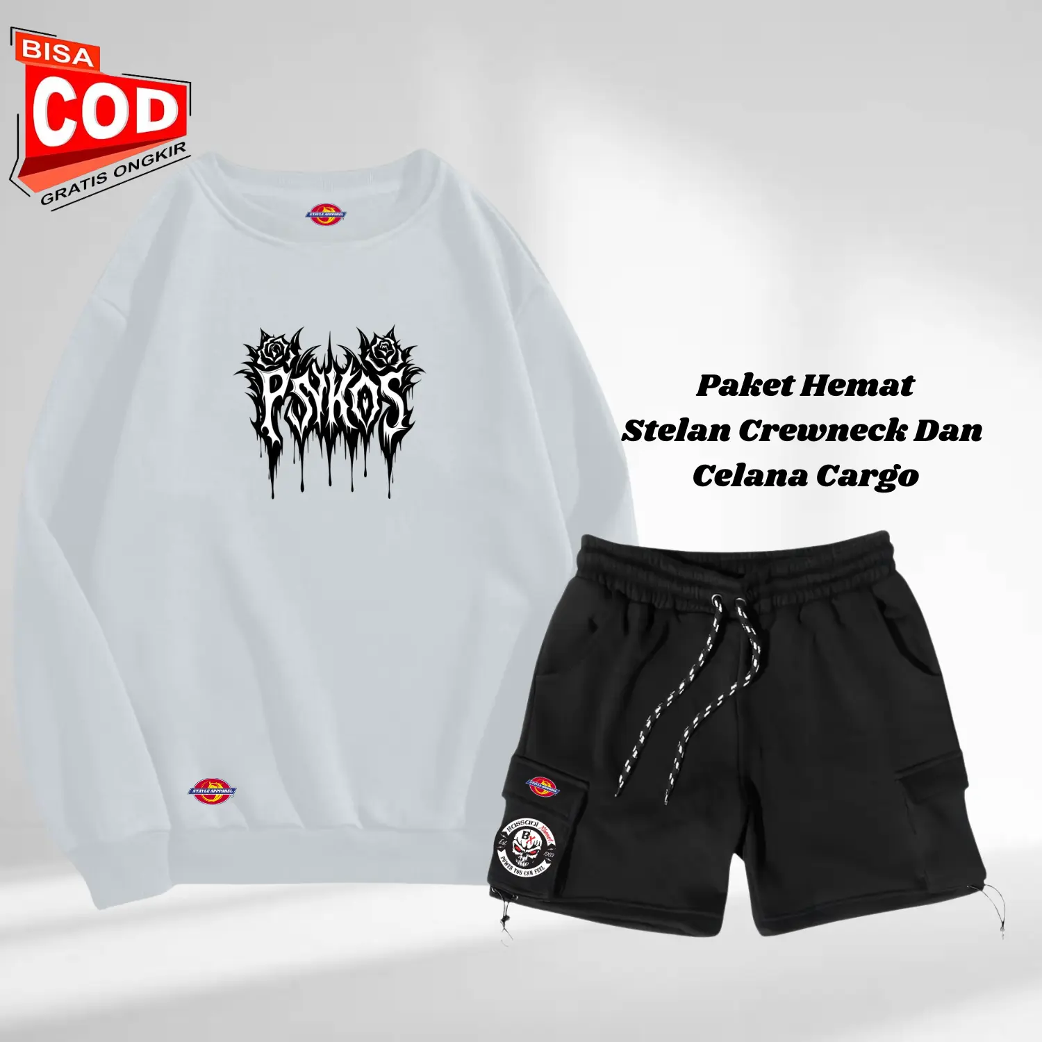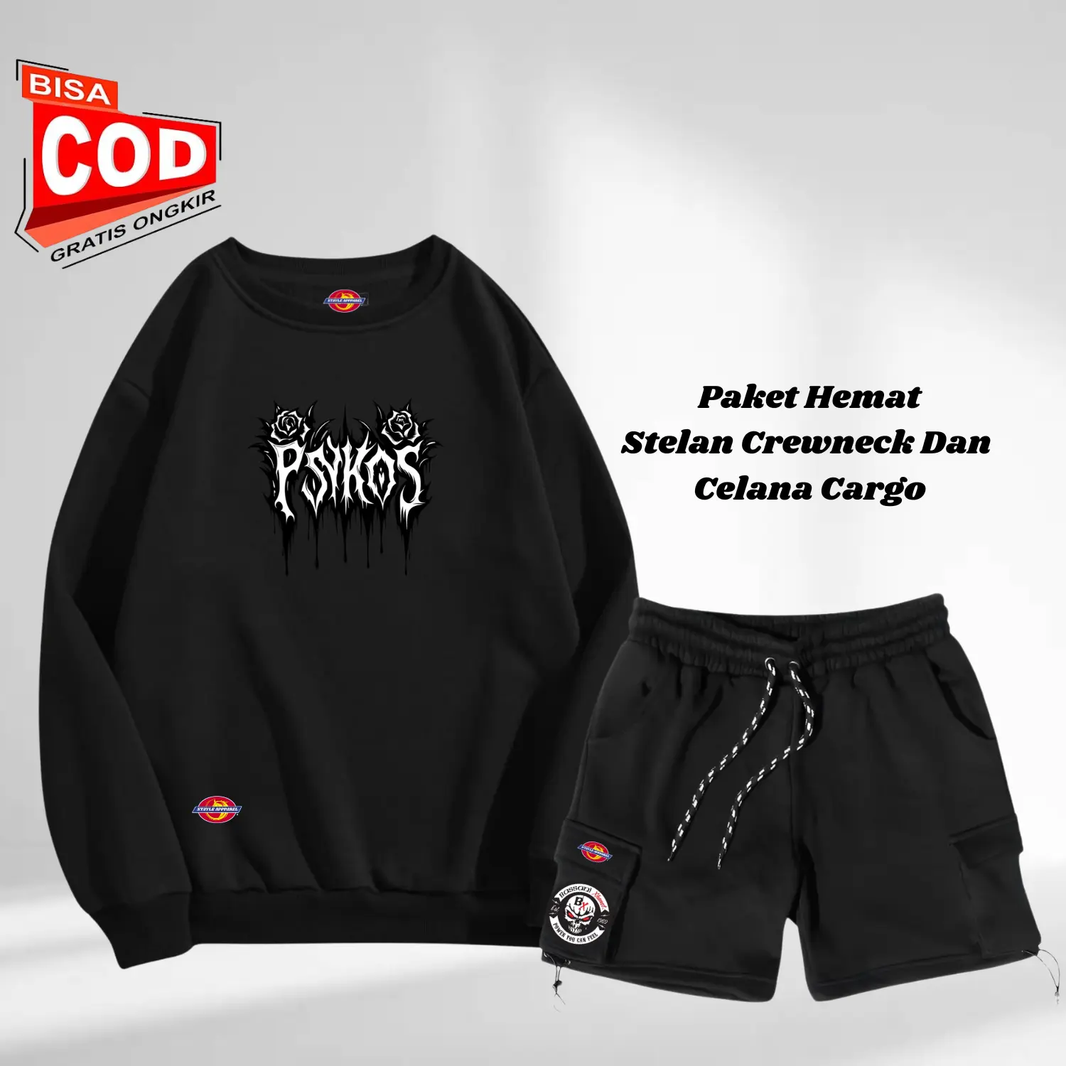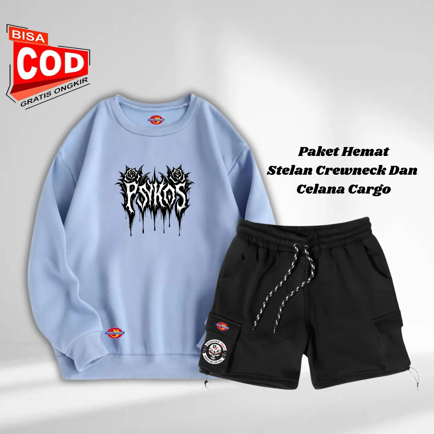 5. Stelan Oneset Crewneck Switer Dan Celana Pendek Cargo Pria Wanita Distro Setelan Sweater Oblong Logo pesikos Dada Cruneck Celana Keren Bahan Flecee