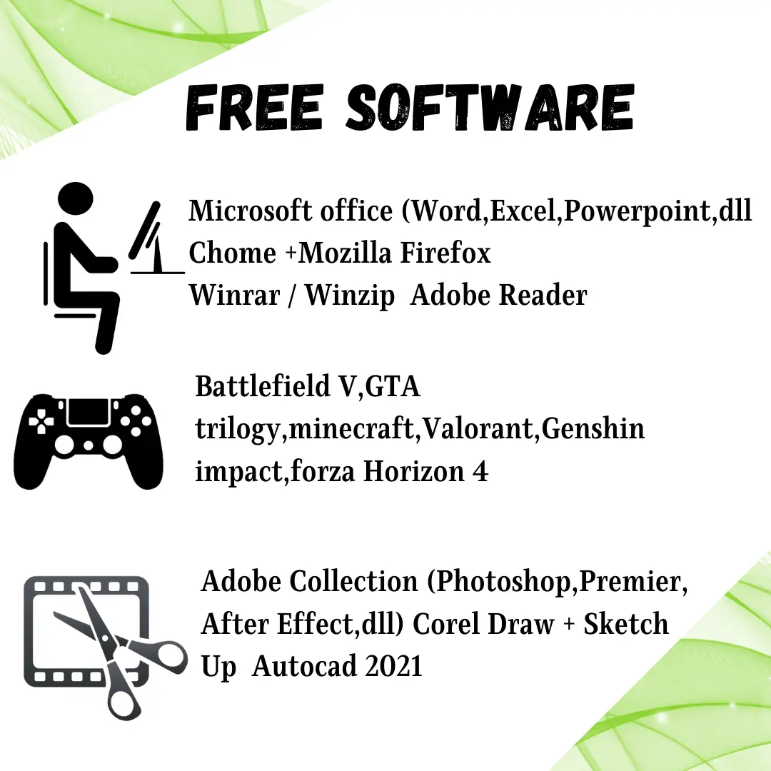 keyboard mouse logiteck MK120 Wifi 5G ( bisa diganti LAN card) windows 11+ office (ORI) Garansi 3 Tahun (1 tahun sparepart, 2 tahun service tergantung masing" brand) Note : Free up to 5 games (tergantung kapasitas masing" ssd Free Software Office Microsoft Office (Word, Excel, Powerpoint, dll) Chrome + Mozilla Firefox Winrar / Winzip Adobe corel photoshop berikut kami insall bbrp game kalo ada yang ingin ditanyakan bisa hubungi O8I3 | II3O | 3939