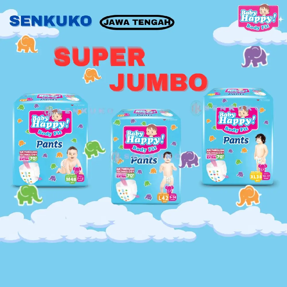 Baby Happy Super Jumbo adalah popok celana sekali pakai yang dirancang untuk kenyamanan bayi. Popok ini memiliki bahan yang lembut, daya serap tinggi, dan anti-bocor, sehingga menjaga kulit bayi tetap kering dan nyaman. Kemasan Super Jumbo tersedia dalam beberapa ukuran.