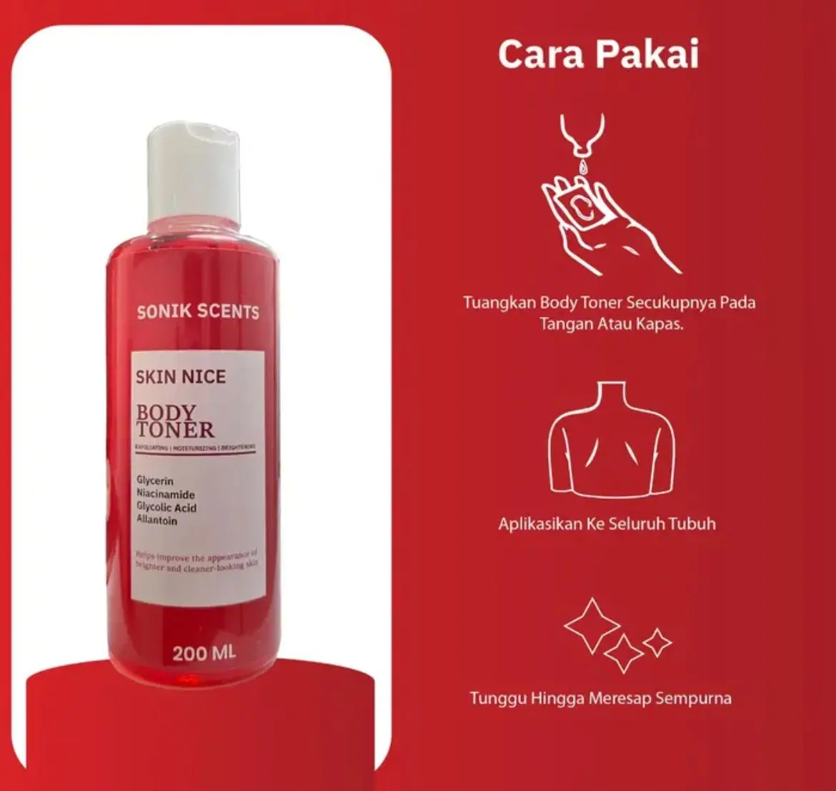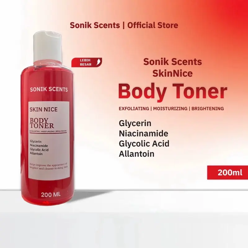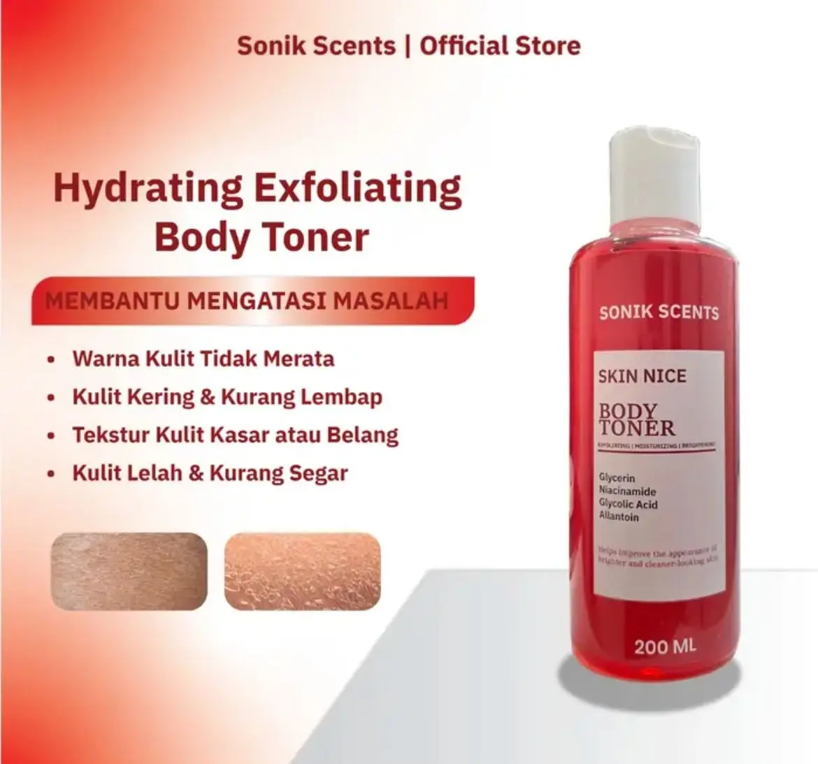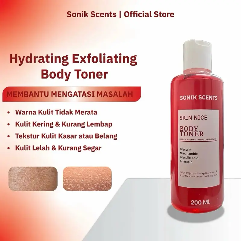 Sonik Scents Skin Nice Body Toner adalah toner tubuh yang diformulasikan untuk mengangkat sel kulit mati, melembapkan, dan membantu mencerahkan warna kulit secara bertahap. Dengan kombinasi exfoliant lembut dan hidrasi mendalam, toner ini membantu menjadikan kulit tubuh, cerah, terawatt dan terlihat bercahaya.
