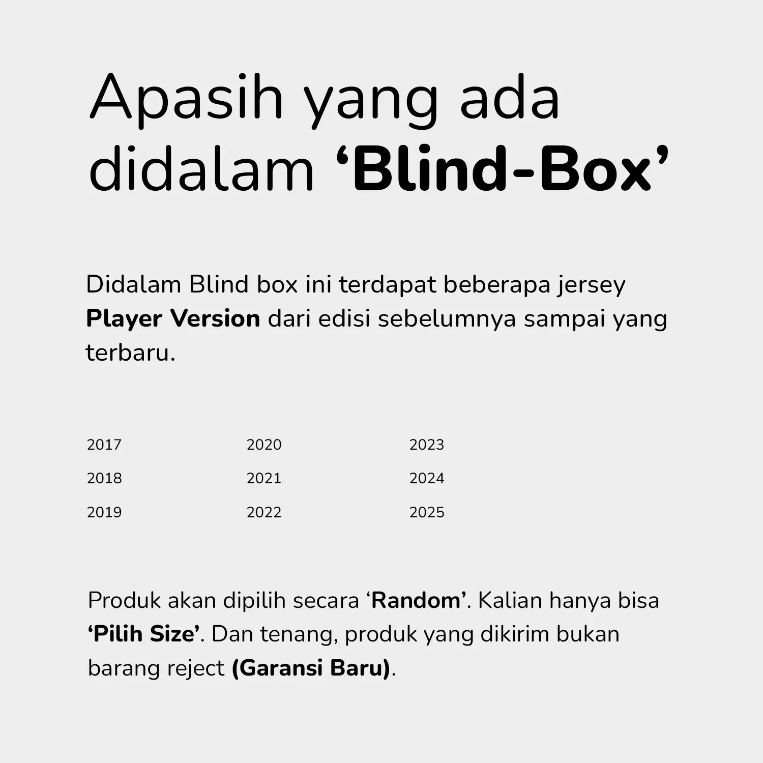 Blind Box is Back! Nikmati experience unboxing Blind Box yang menyenangkan dengan Promo Special dari Arosbaya Jersey. Syarat dan ketentuan: 1. Sebuah paket berisikan 2 pcs Jersey Player Version 2. Produk yang akan dikirim secara random 3. Bukan produk reject/minor, kualitas sama dengan produk lainnya 4. Jika anda sudah membeli berarti anda sudah menyetujui semua barang yang ada di dalam blind box ini. 5. Produk tidak bisa ditukar / dikembalikan (Kecuali rusak diperjalanan). [Details] Packaging: Plastic Polymailer. Size Chart: S: Panjang 67 cm x Lebar 49 cm M: Panjang 69 cm x Lebar 51 cm L: Panjang 71 cm x Lebar 53 cm XL: Panjang 73 cm x Lebar 55 cm (Toleransi: +/- 1-2 cm dikarenakan setiap apparel memproduksi Jersey dengan size yang berbeda-beda) Size Recommendation: Tinggi 160-167 cm x Berat Badan 50-65: Size S Tinggi 167-173 cm x Berat Badan 65-70: Size M Tinggi 173-175 cm x Berat Badan 70-73: Size L Tinggi 175-178 cm x Berat Badan 73-76: Size XL (Namun biasanya preferensi setiap orang berbeda-beda sehingga ukurannya kami serahkan kembali ke pembeli). Informasi Pengiriman Barang : - Senin s/d Jumat batas transfer pkl. 17.00 WIB - Sabtu s/d Minggu batas transfer pkl. 15.00 WIB - Update resi oleh ekspedisi pkl. 21.00 - 24.00 WIB Notes: - Warna yang terlihat pada gambar mungkin tidak 100% sama dengan produk yang sebenarnya, disebabkan karna proses pencahayaan pada pengambilan gambar atau kualitas layar gadget yang digunakan untuk melihat gambar. - Siapkan Video Unboxing sebagai antisipasi/bukti apabila barang yang diterima tidak sesuai/cacat (Garansi berlaku 1 x 24 Jam setelah barang sampai) - Usahakan sebelum checkout, tanyakan kembali melalui chat terkait ketersediaan produk, untuk meminimalisir pembatalan secara otomatis.