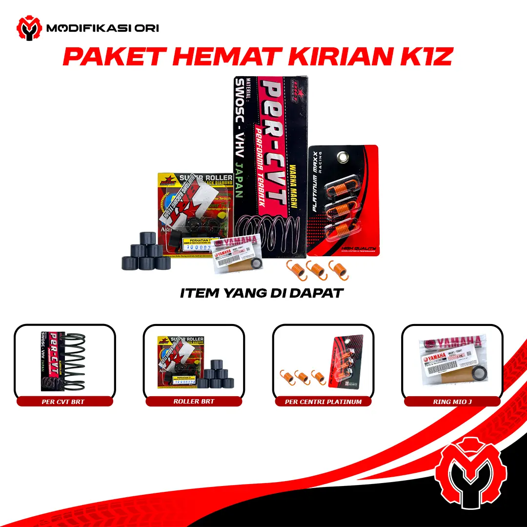 Paket Komplit Kirian BRT dari Modifikasi Ori adalah solusi upgrade CVT yang dirancang untuk meningkatkan performa motor matik secara menyeluruh. Menggunakan kombinasi komponen BRT dan part custom pilihan, paket ini menghasilkan akselerasi lebih cepat, tarikan halus tanpa gredeg, serta performa yang stabil di berbagai kondisi jalan.