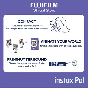 Making small moments feel big The one and only INSTAX Pal – a super small digital camera eager to capture small, spontaneous moments. And with a built-in wide-angle lens, you get more of what you love. More landscape. More friends. More fun. Although this camera is pocket friendly, with a choice of five exciting colours, the INSTAX Pal won’t be spending much time tucked away. Instead, record your personalised pre-shutter sounds and get to grips with the multi-use detachable ring – for a better view, an easier hold and the ultimate self-timer stand. When you’re ready for the big reveal, transfer your shots to the INSTAX Pal smartphone app using Bluetooth to create INSTAX animations, play with filters and finally print off via an INSTAX Link printer. Or print directly from camera to an INSTAX Link printer for a super, spine-tingling surprise. Key Features Pocket-sized Wide-angle lens INSTAX Pal holds up to 50 photos at a time Connects wirelessly to smartphones via Bluetooth Super interactive app Personalized pre-shutter sounds Available in Gem Black, Milky White, Powder Pink, Pistachio Green and Lavender Blue Shoot in mini, SQUARE or WIDE formats Interval and remote shooting capabilities Print directly to INSTAX Link printers