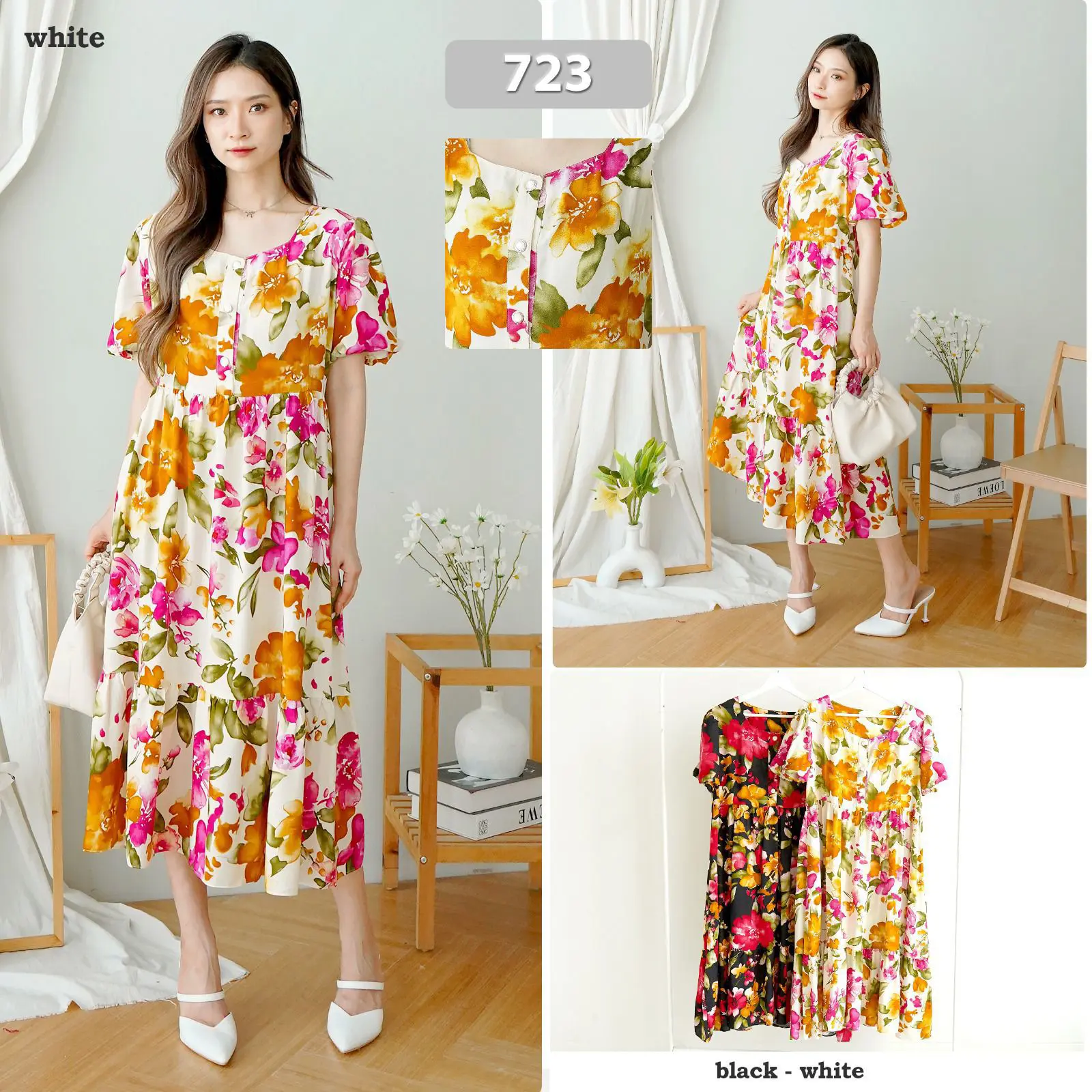 [ Siro ] Midi Dress Felia Flower Rayon Twill halus Premium Detail: - Lingkar Dada : 100-110cm - Panjang : 105cm - Kancing Aktif - Tgn Model balon Tersedia dalam 2 warna pilihan : - Putih - Hitam Rayon Twill Halus Premium Kualitas import , adem dan nyaman Dear customer , sebelum melakukan order, mohon dengan hormat untuk membaca ketentuan terlebih dahulu. Pastikan untuk merekam video unboxing dengan detail saat menerima paket. Ini sangat penting agar kami dapat membantu dengan cepat jika ada kendala. Video ini penting banget biar kita bisa bantu kalau ada masalah. Jika komplain tidak disertai video unboxing tidak akan kami proses. Semua Produk sudah kita cek sebelum dikirim. Pengiriman setiap Senin-Sabtu (08.00-18.00), konfirmasi pembayaran sebelum jam 13.00, jika pemesanan diatas jam 13.00 akan dikirim di hari berikutnya. Pengiriman Libur Minggu & tanggal merah. untuk memastikan stoknya, jangan lupa tanyakan dulu sebelum order ya Terima kasih Happy Shopping