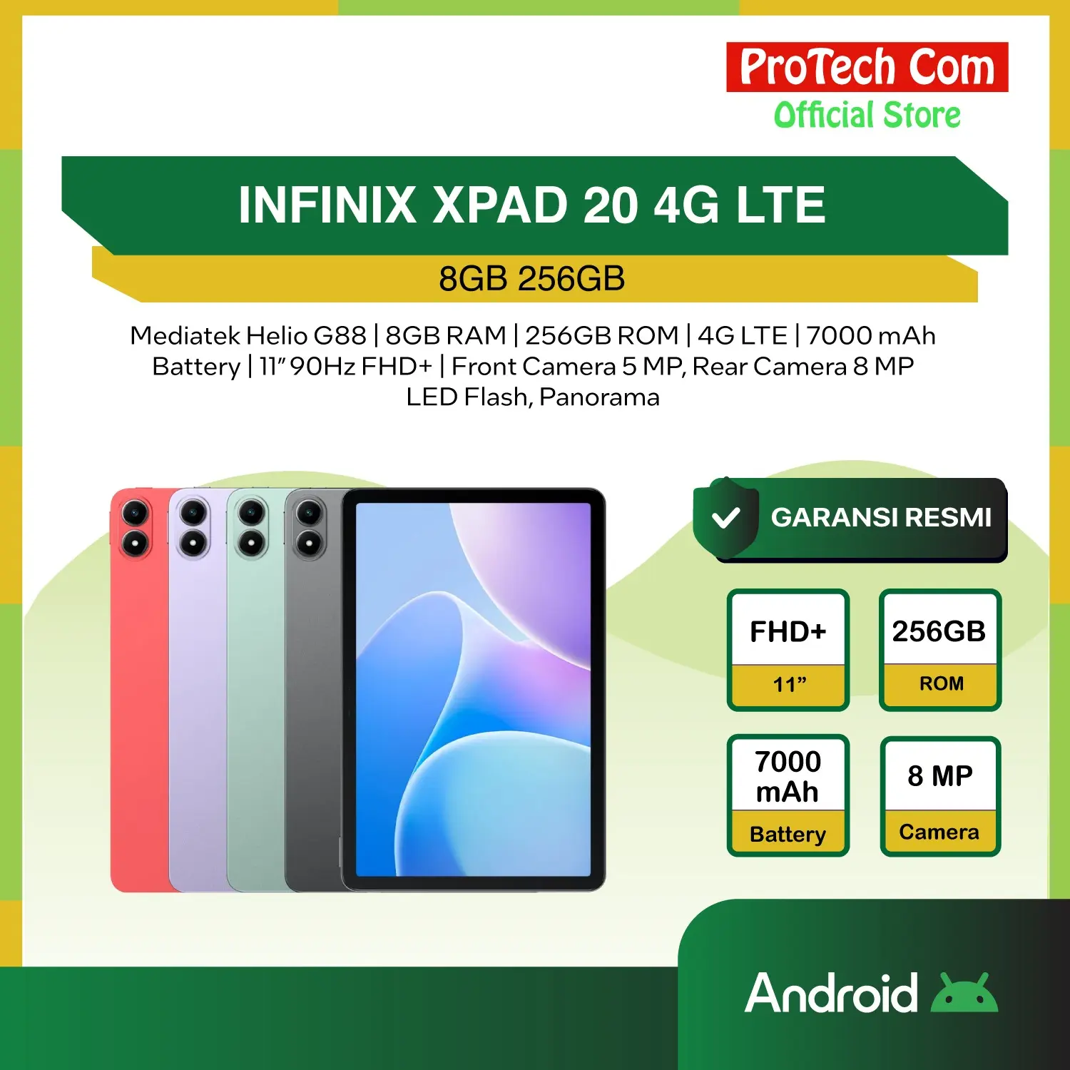 INFINIX XPAD20 LTE 8GB 256GB FOREST GREEN / RISING RED / STELLAR GREY spesifikasi: Processor : Mediatek Helio G88 (12 nm) Operating System : Android 15 Ram : 8GB Rom : 256GB Display : 11″ 90Hz FHD+ Battery : 7000 mAh Charging : 10W wired Network : 4G LTE Camera : Front: 5 MP, Rear: 8 MP LED Flash, Panorama