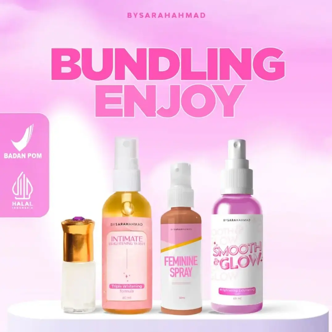 BUNDLING ENJOY (Feminine spray, Brightening wash, Misk taharah, Smooth&glow) BUNDLING ENJOY berisi 4 produk. (Feminine spray, Misk, Brightening wash, Smooth Glow) dengan manfaat sebagai berikut : - membantu mencerahkan area sekitar dan mengurangi gatal di area sekitar (BPOM RI NA18221600024). - dengan ekstrak manjakani, ekstrak sirih hijau, dan lactic acid yang dapat membantu membersihkan area sekitar, membantu dan mencegah perkembangan bakteri penyebab bau ( BPOM RI NA18211600085 ) - Misk diformulasikan untuk wewangian (BPOM RI NA18210601140 ) - Smooth & glow membantu mengangkat sel2 kulit mati seperti di area lipatan bagian kewanitaan dan ketiak. Serta membantu untuk mencerahkan warna kulit di area lipatan yang gelap karena mengandung Niacinamide & Aloevera untuk membantu melembabkan dan menghaluskan kulit. (NA18230200589)