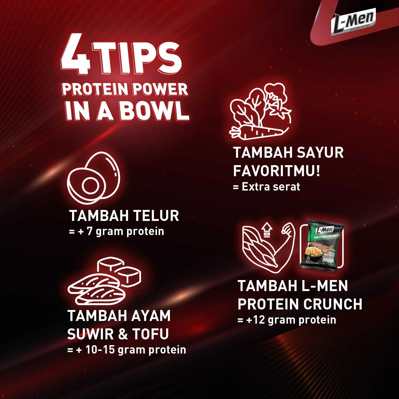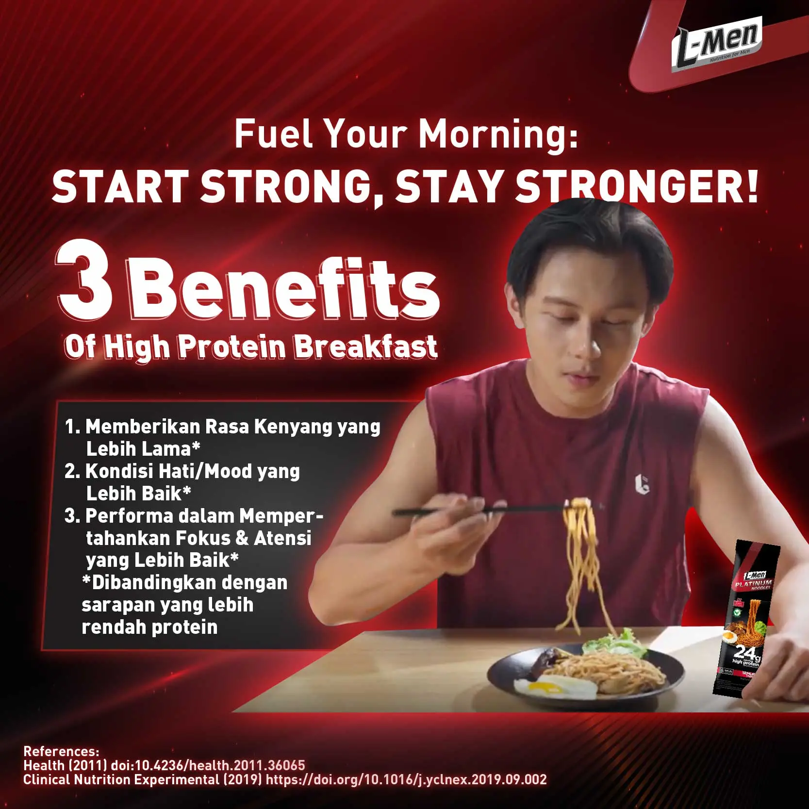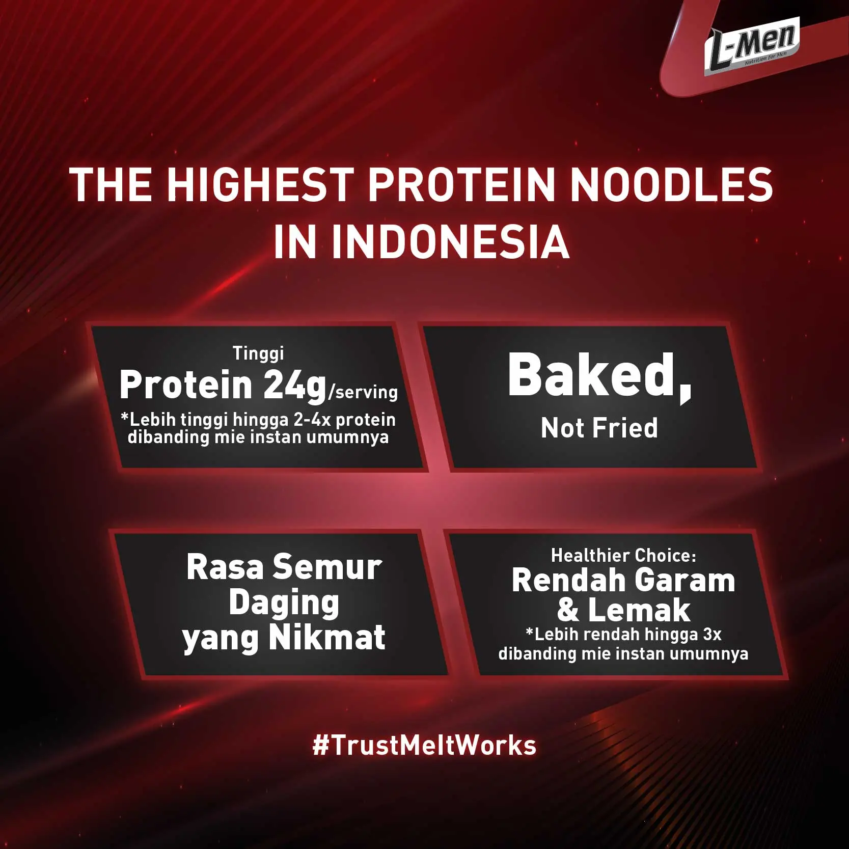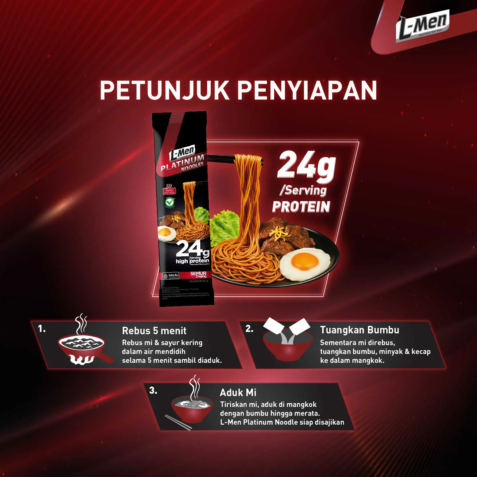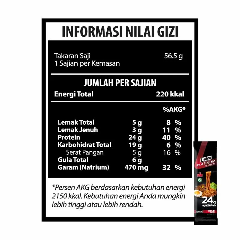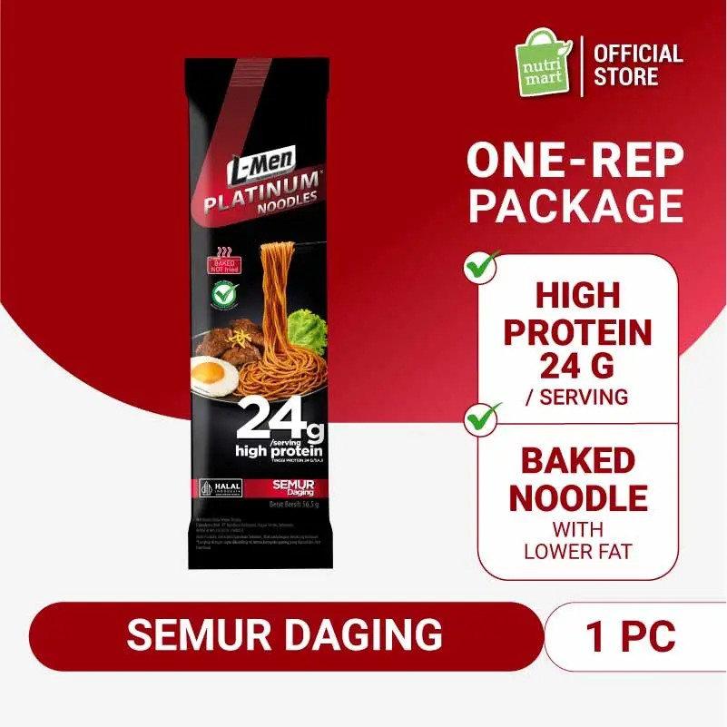 L-Men Platinum Noodle Semur Daging merupkan mie panggang tinggi protein 24g/serving (2-4x lipat lebih banyak dari mie instant pada umumnya (5g-13g protein/saji)), lebih rendah lemak dan garam, pilihan lebih sehat dan tepercaya efektif bantu bentuk tubuh atletis.