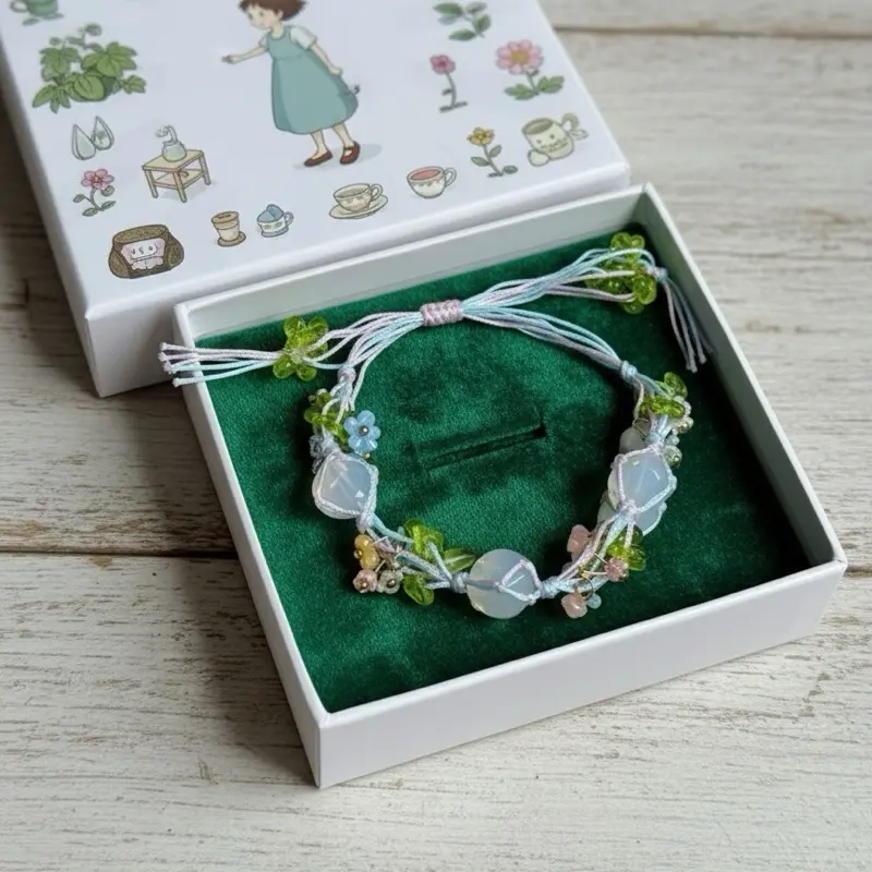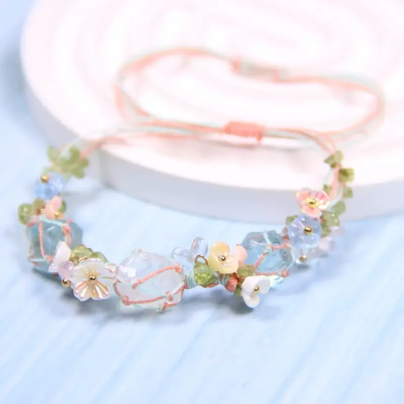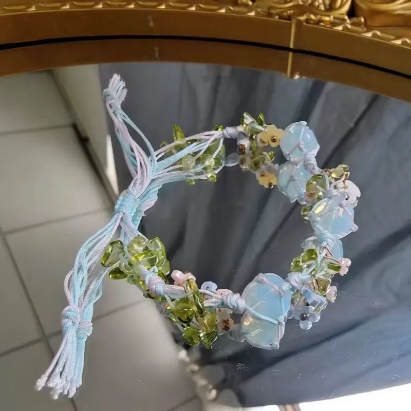 Gelang manis dengan nuansa pastel yang lembut dan feminin. Dihiasi manik-manik kristal opal berkilau, bunga mini berwarna pink dan hijau, serta tali halus bergradasi biru muda.