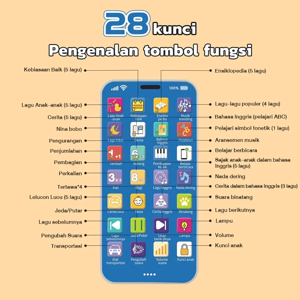Mainan ponsel edukasi anak ini dilengkapi dengan 28 fitur suara interaktif. Cocok untuk belajar dan hiburan anak. Mainan ini berfungsi sebagai HP mainan yang mendukung proses belajar anak.