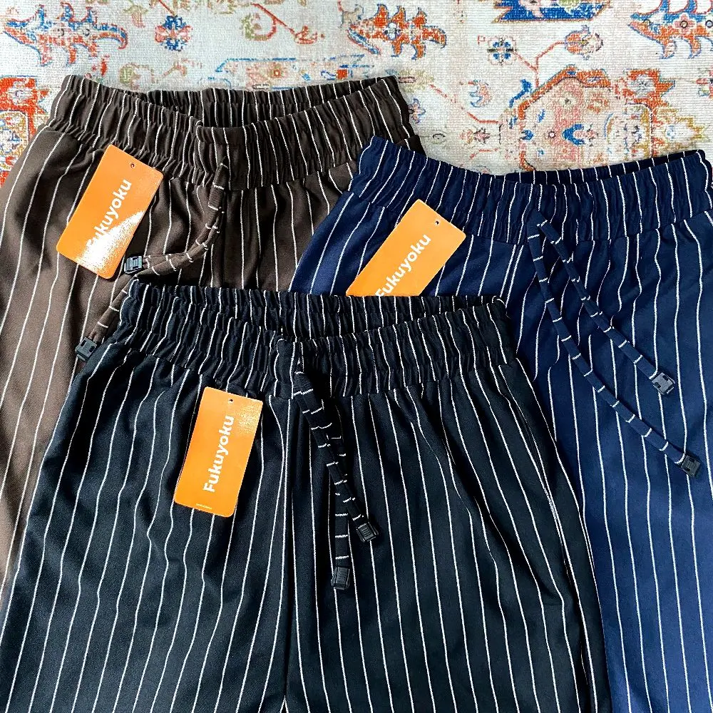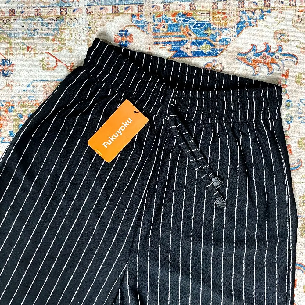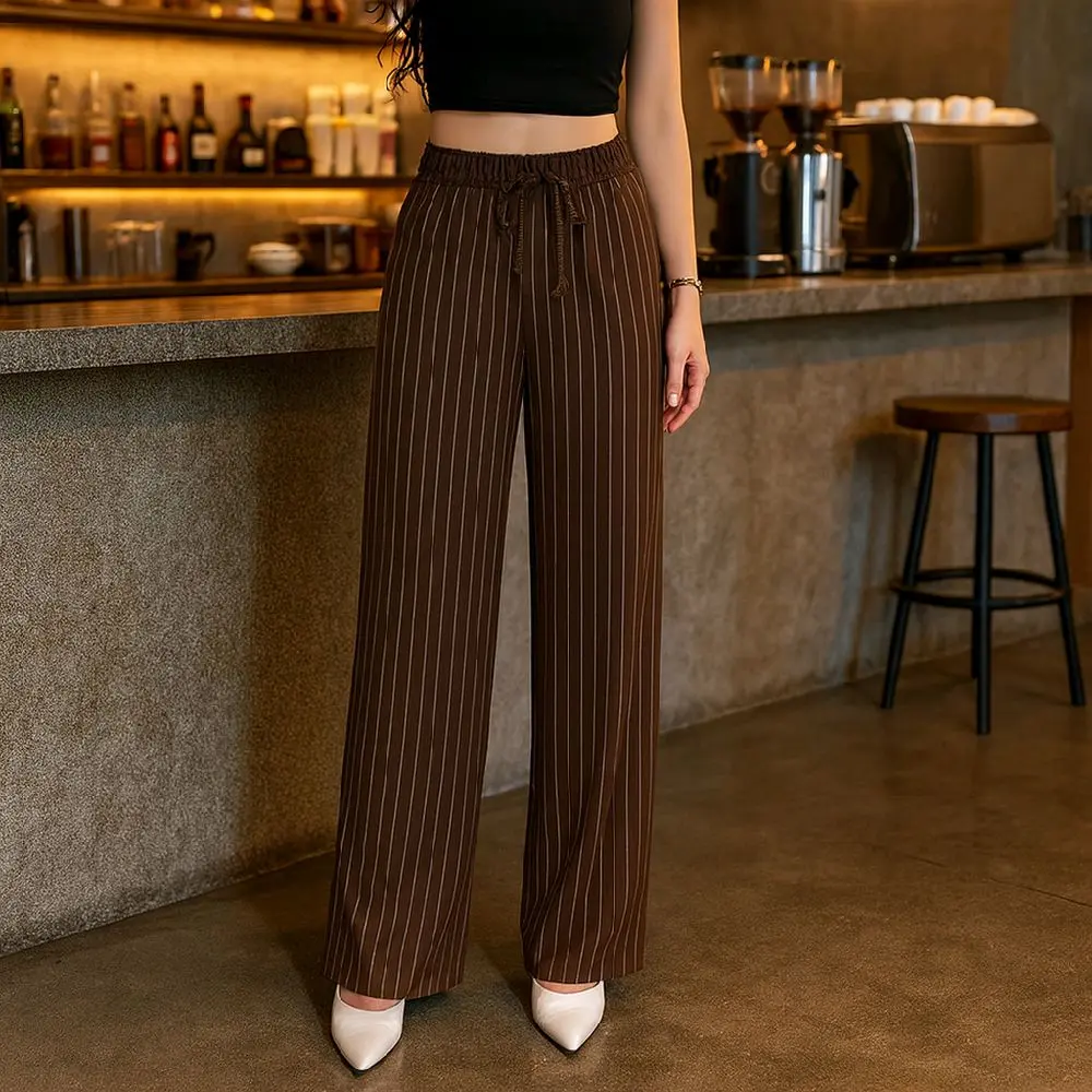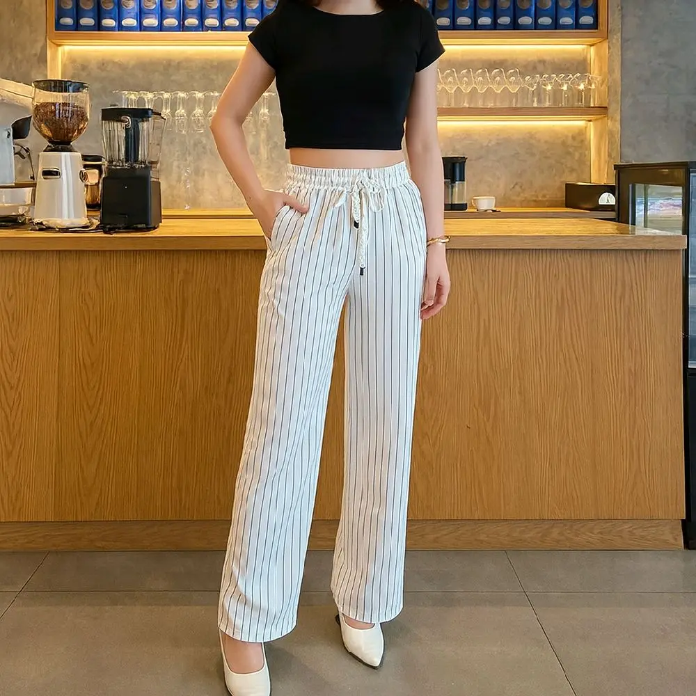 Didesain dengan motif garis vertikal yang memberi efek jenjang pada kaki dan potongan high waist yang mempertegas siluet tubuh.