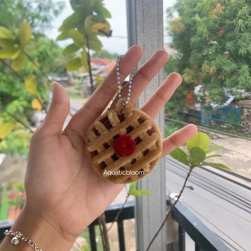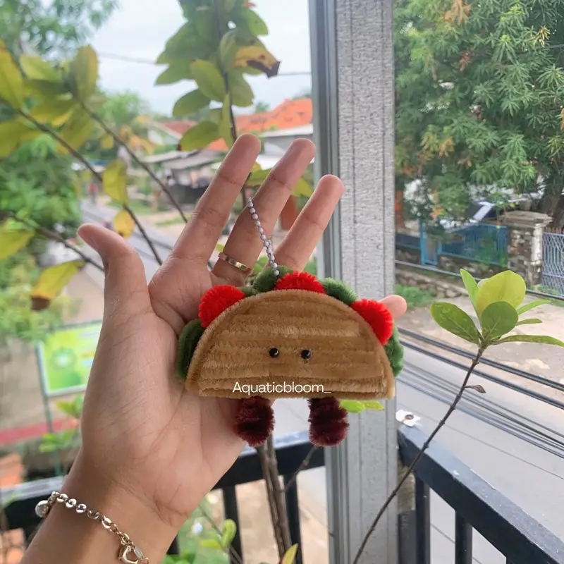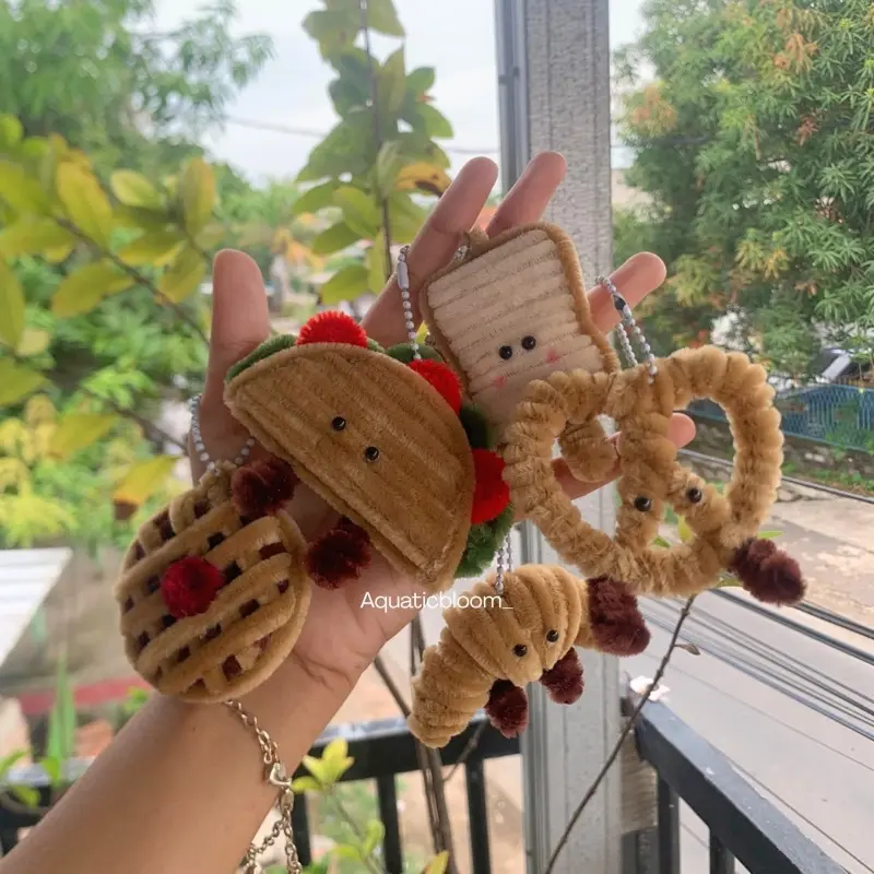 Gantungan kunci handmade berbentuk berbagai jenis food seperti croissant, pretzel, taco, waffle, dan roti. Terbuat dari kawat bulu lembut (pipe cleaner) yang dibentuk dengan detail menyerupai makanan asli dan diberi sentuhan wajah mungil yang menggemaskan 😍