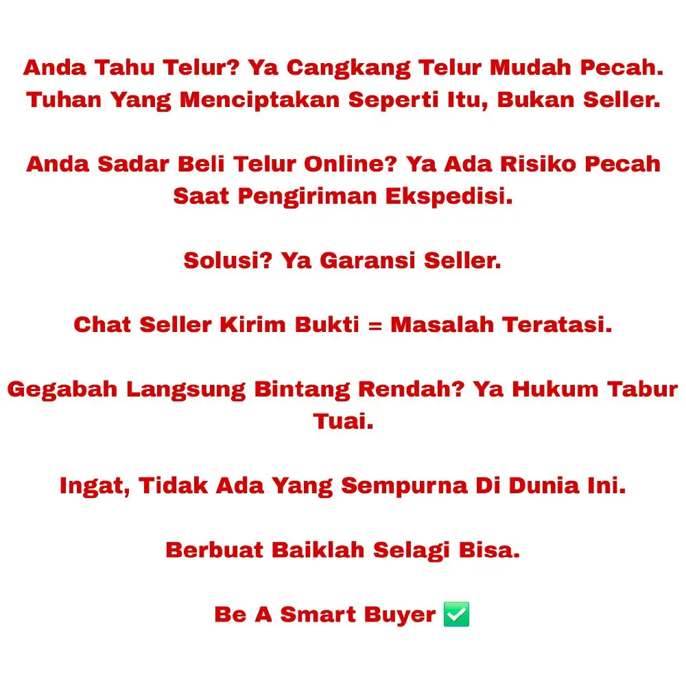 Sebelum kirim, kami sudah 3x Quality Control Telur Utuh dan Packing Kami Usahakan Tebal. Kalau yang diterima retak/pecah itu karena pengiriman. Bisa chat kami kirim bukti video unboxing untuk solusinya ya. Semua hal bisa dibicarakan baik-baik. Yuk sama-sama berproses menjadi orang yang lebih baik, jangan kebalikannya.