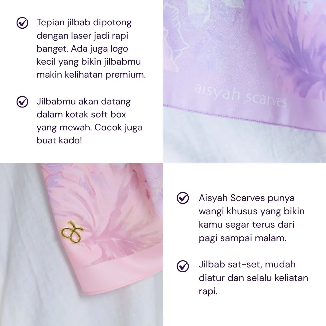 10 warna Aqsa pattern scarf menggunakan bahan terbaik di kelasnya, Crepe, dengan motif bunga dan pilihan warna-warna basic. Hijab pashmina crepe merupakan pilihan terbaik untuk gaya hijab yang ringan dan lembut, mudah dikenakan dan sangat nyaman digunakan, sesuai untuk berbagai kesempatan. Series ini dibuat khusus untuk kamu #SmartLadies, untuk menemani hari-harimu bekerja ataupun aktivitas lainnya. Perawatan yang tepat akan menjaga keindahan dan ketahanan hijab ini agar tetap terjaga dalam penggunaan sehari-hari.