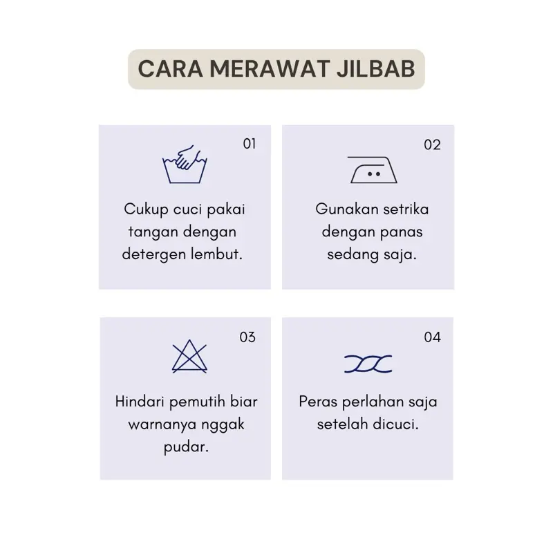 ·Jangan Merendam Terlalu Lama: Hindari merendam hijab terlalu lama dalam air sabun atau bahan pembersih lainnya untuk mencegah perubahan warna atau kerusakan bahan.