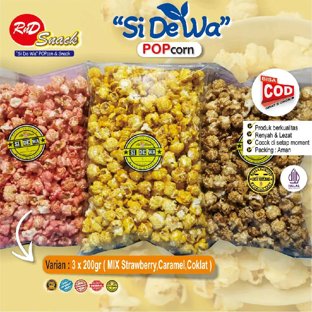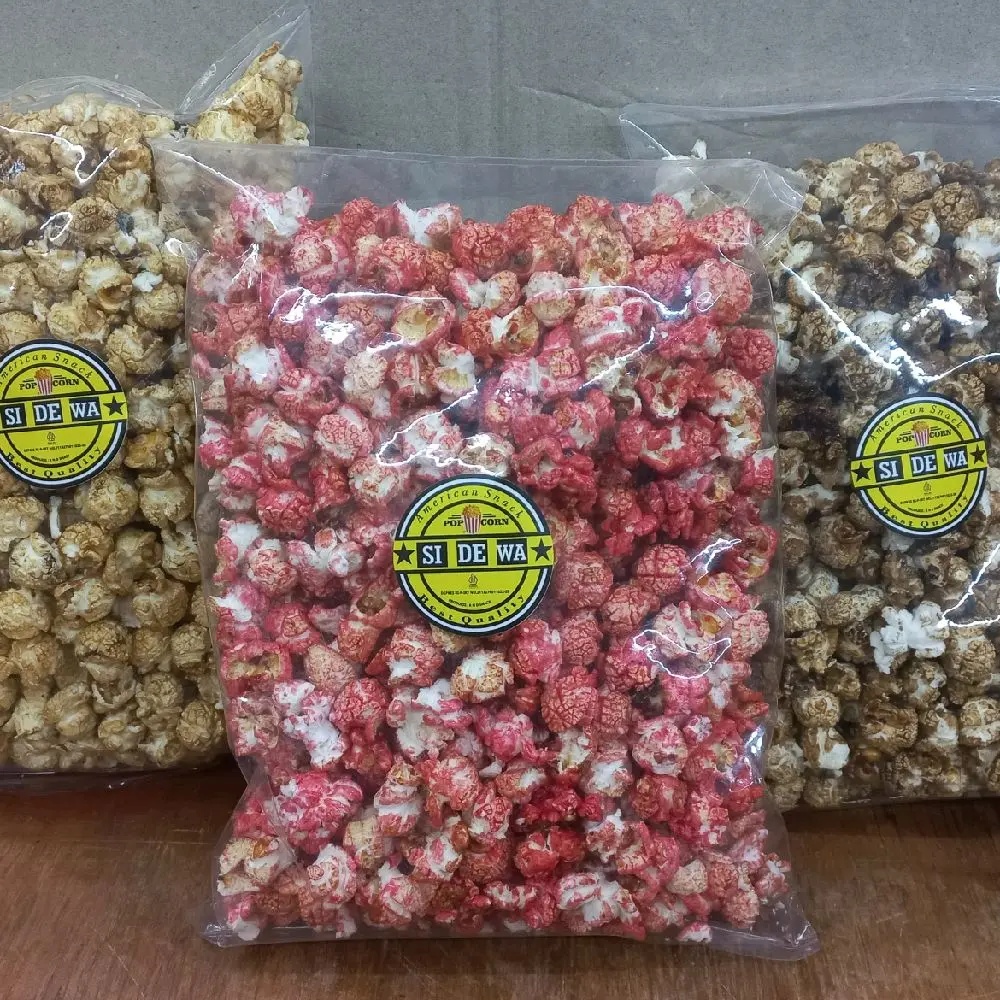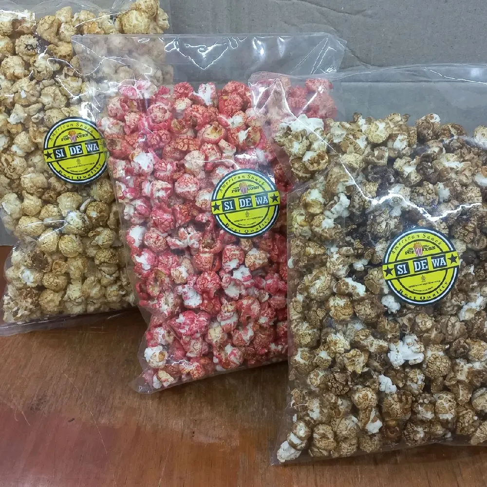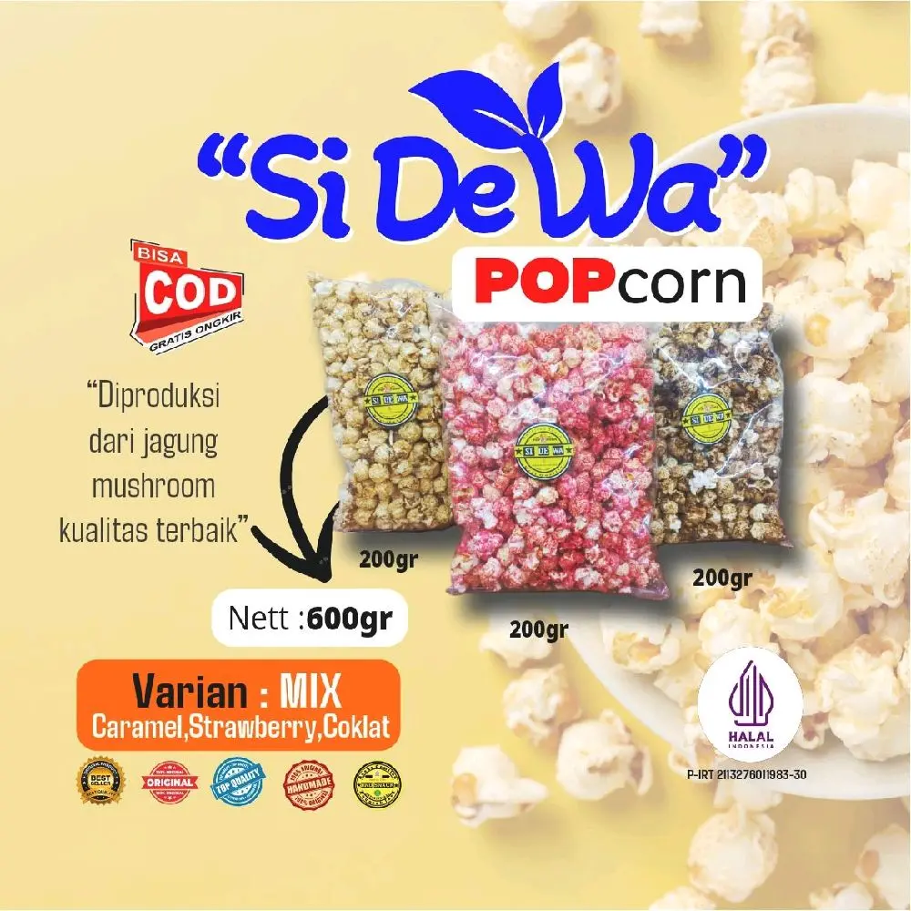 SI DE WA POPCORN di produksi langsung dengan bahan biji jagung mushroom import US berkualitas di padukan dengan gula caramel dan minyak kelapa tanpa bahan pengawet, yang aman untuk di konsumsi dan menemani suasana santai anda.