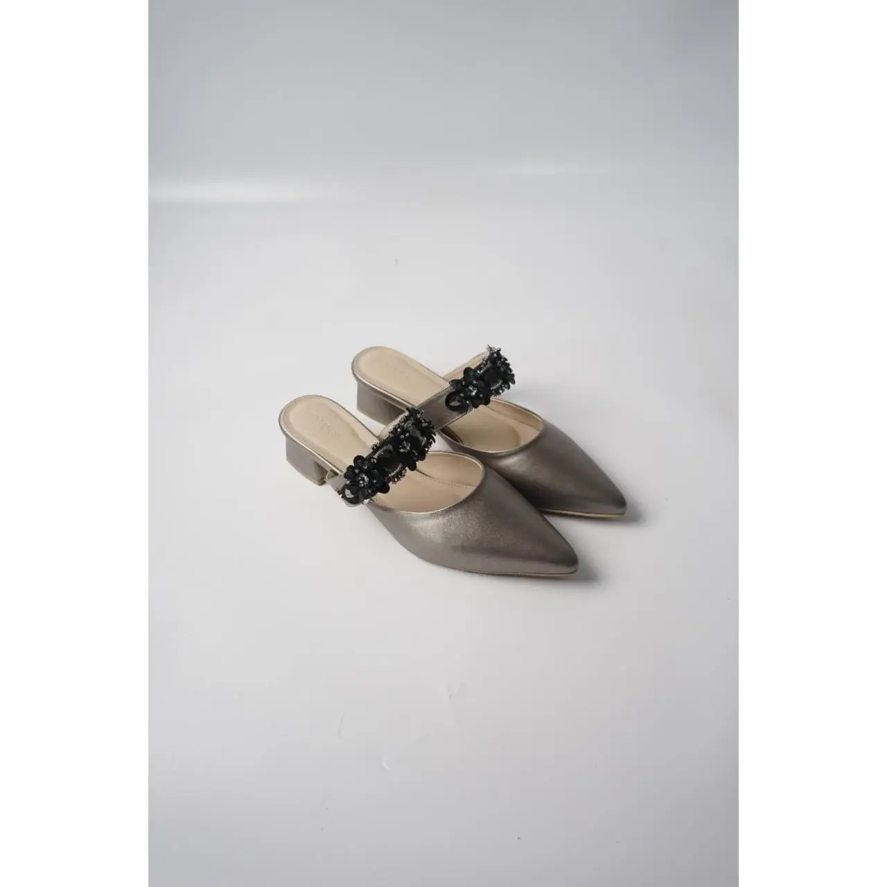 Made with premium vegan leather Pointed toe mules with slip-on style  Handcrafted 3D beadworks on strap  4 cm Block heel True to size fit  Available in size 36-41
