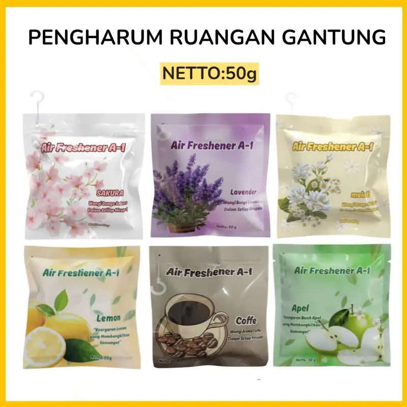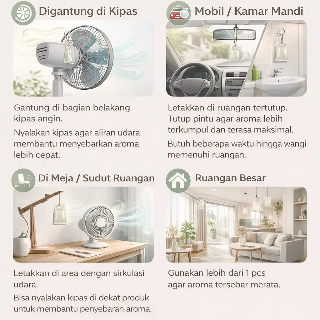 • Sakura / Melati: aroma floral yang cocok untuk ruang tamu dan lemari.