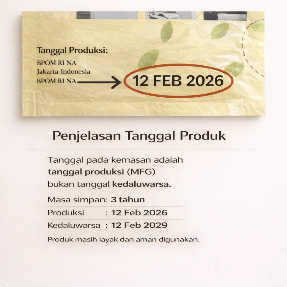 ·Tanggal yang tertera pada kemasan adalah tanggal produksi, bukan tanggal exp , masa simpannya adalah 3 tahun.