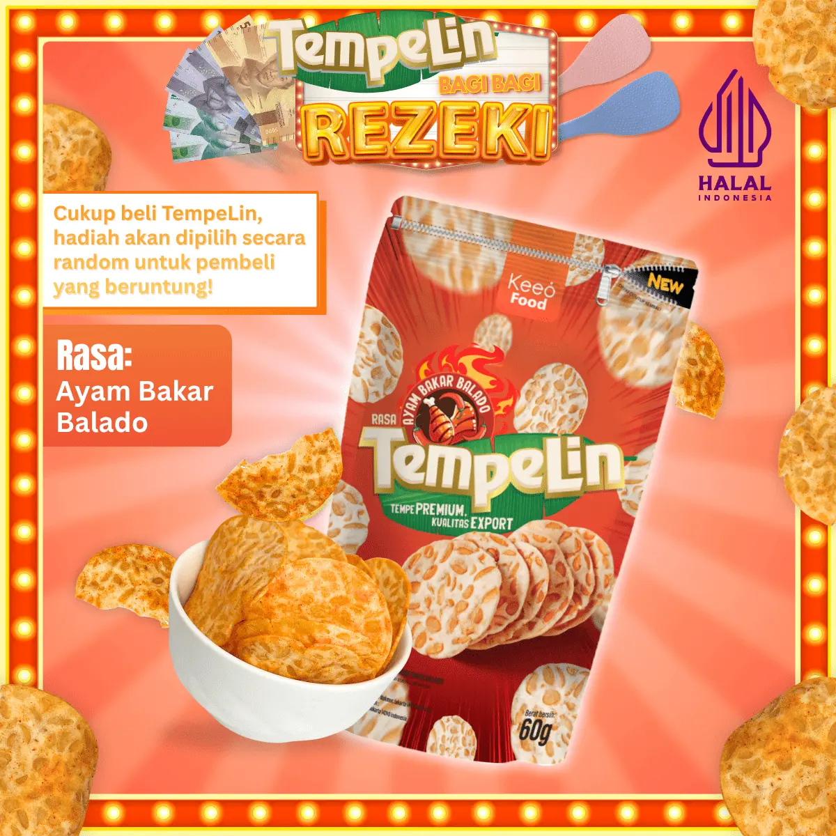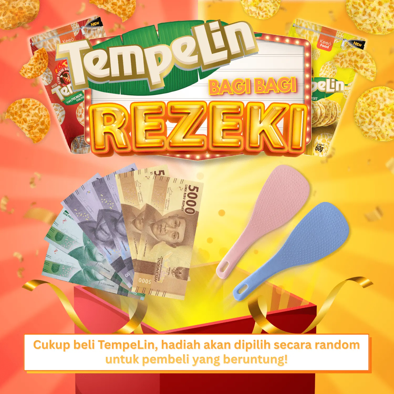 Setiap pembelian Tempelin khusus di Keeo Food berkesempatan mendapatkan hadiah uang tunai dan gimmick menarik di belakang kemasan, jika kamu beruntung!