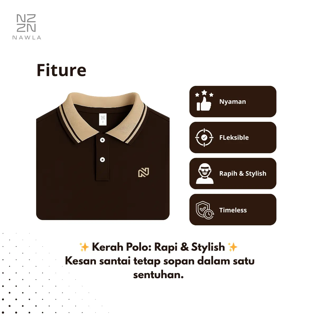 NAWLA menawarkan kaos polo basic pria dewasa dengan lengan pendek. Terbuat dari bahan Lacoste CVC, tersedia dalam warna Navy, Green, Maroon, Black, dan Coffee.