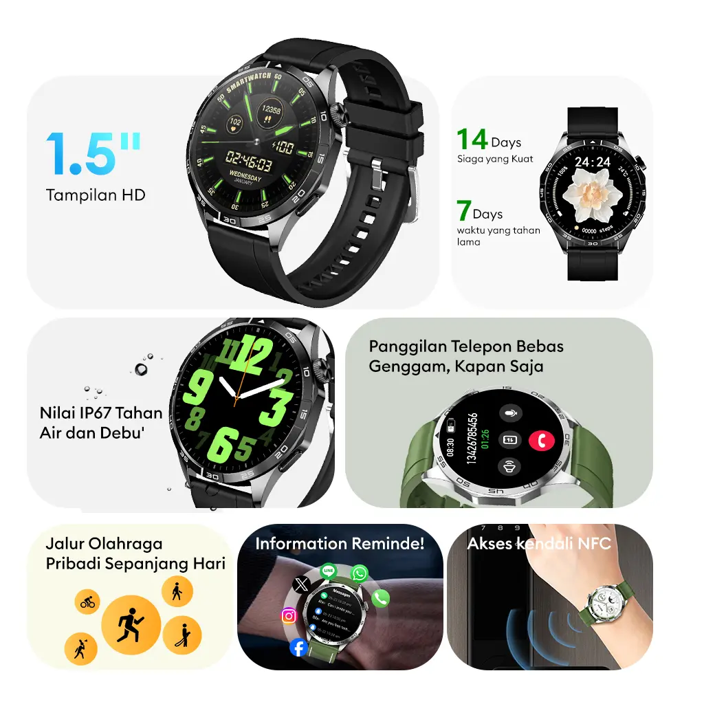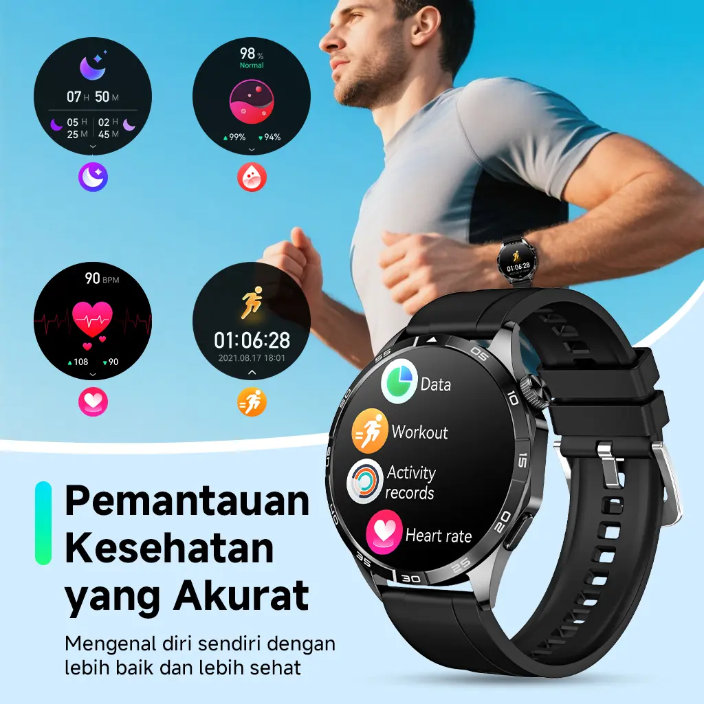- Notifikasi Pintar: Terima notifikasi penting langsung di pergelangan tangan Anda.