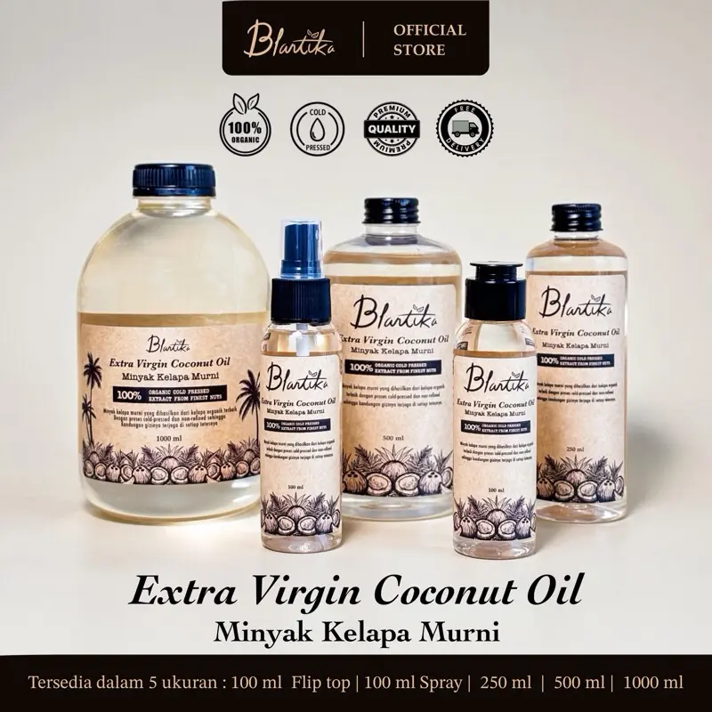 ✨ Pilih ukuran yang sesuai: Blantika Extra Virgin Coconut Oil tersedia dalam 100 ml flip top, 100 ml spray, 250 ml, 500 ml, dan 1000 ml. Produk ini berlaku selama 2 tahun setelah produksi. Komposisi 100% minyak kelapa murni. PIRT: 26357801089827. Halal ID35110016026390324.
