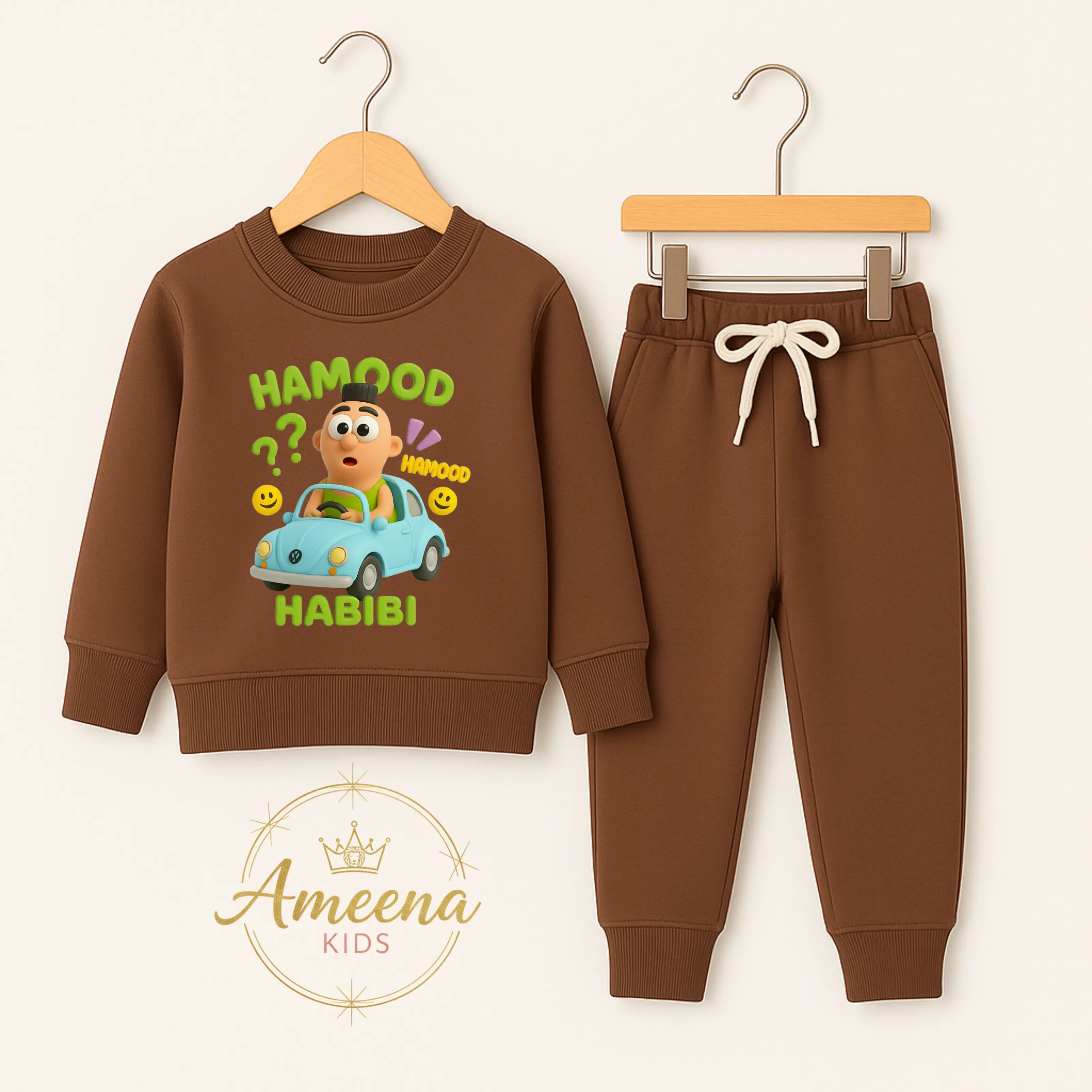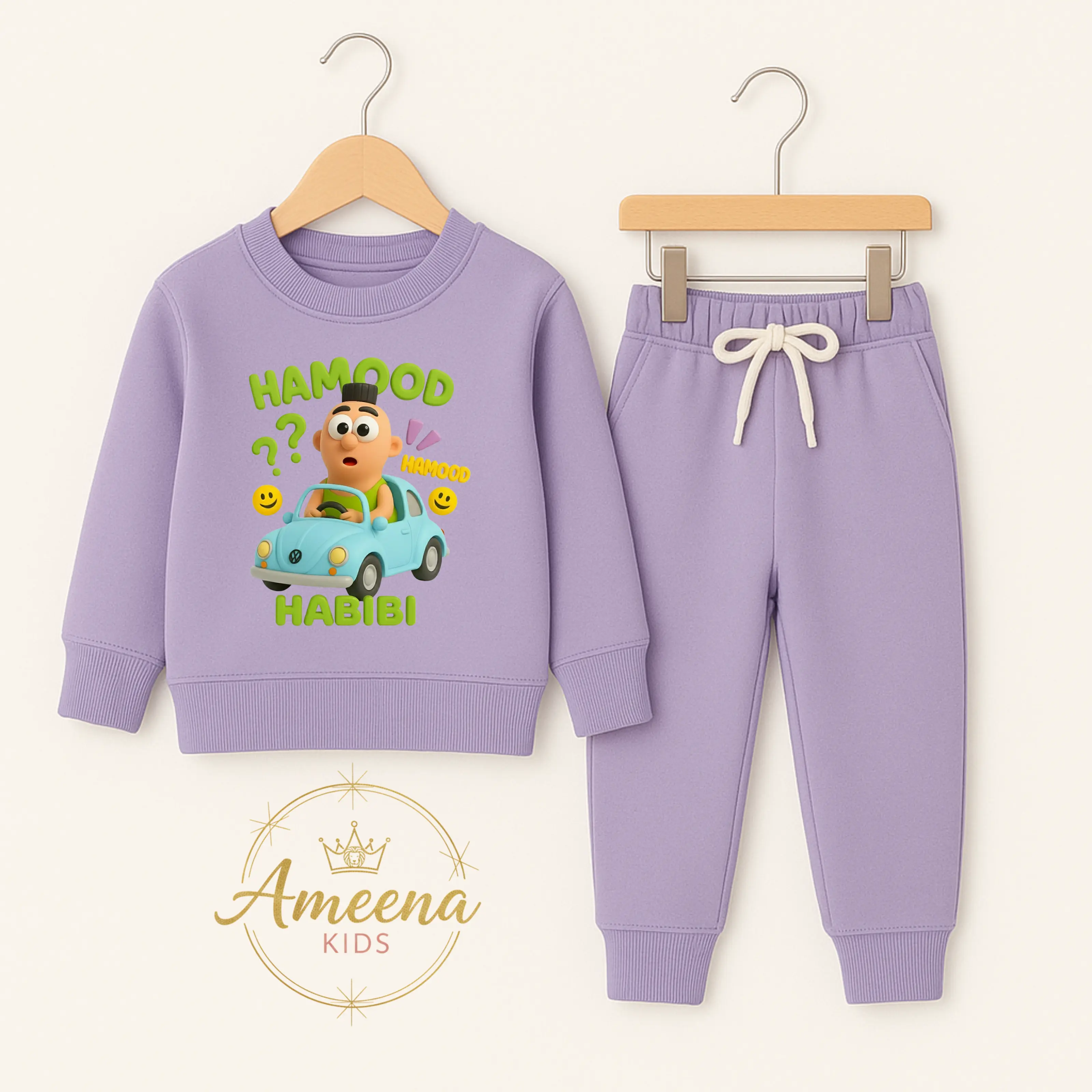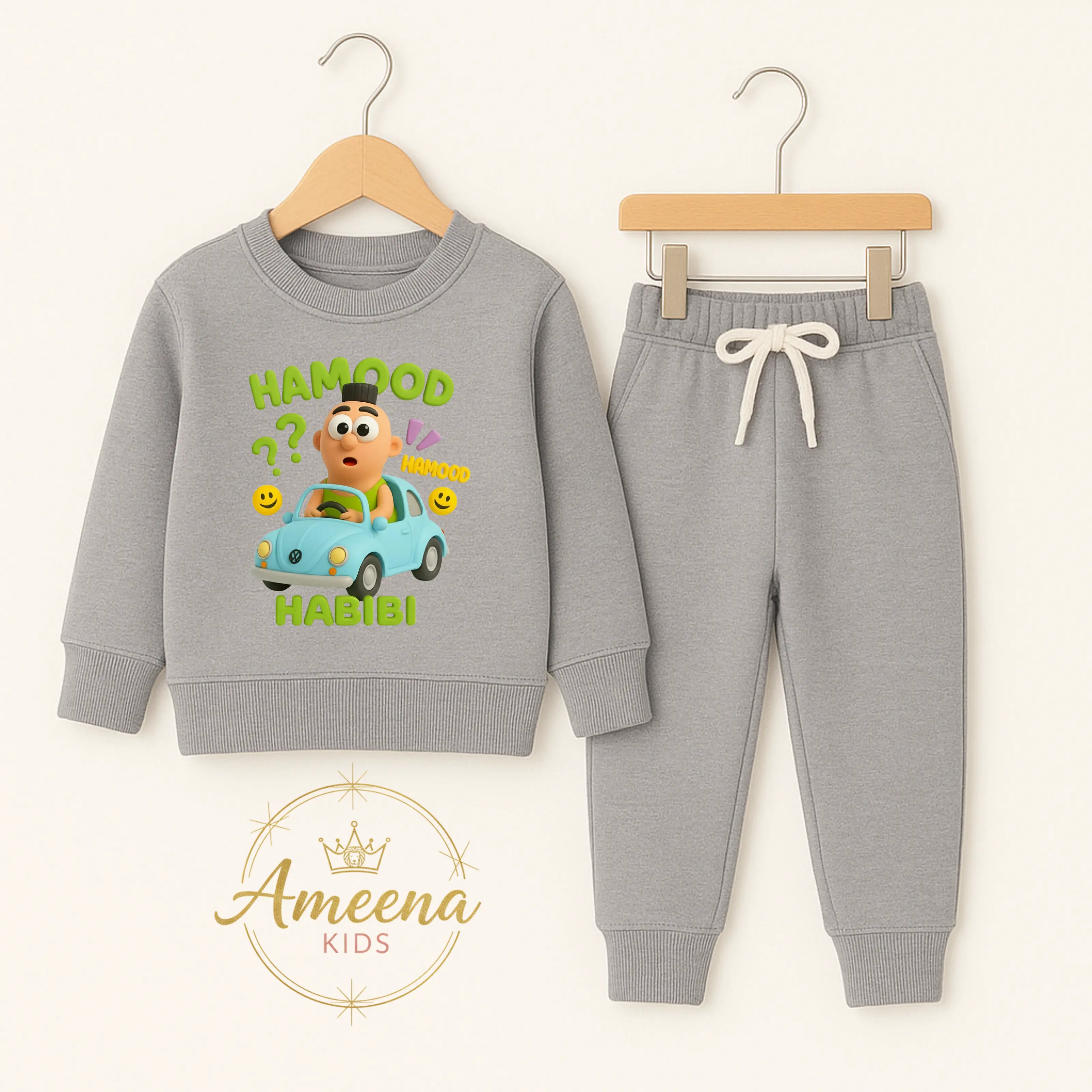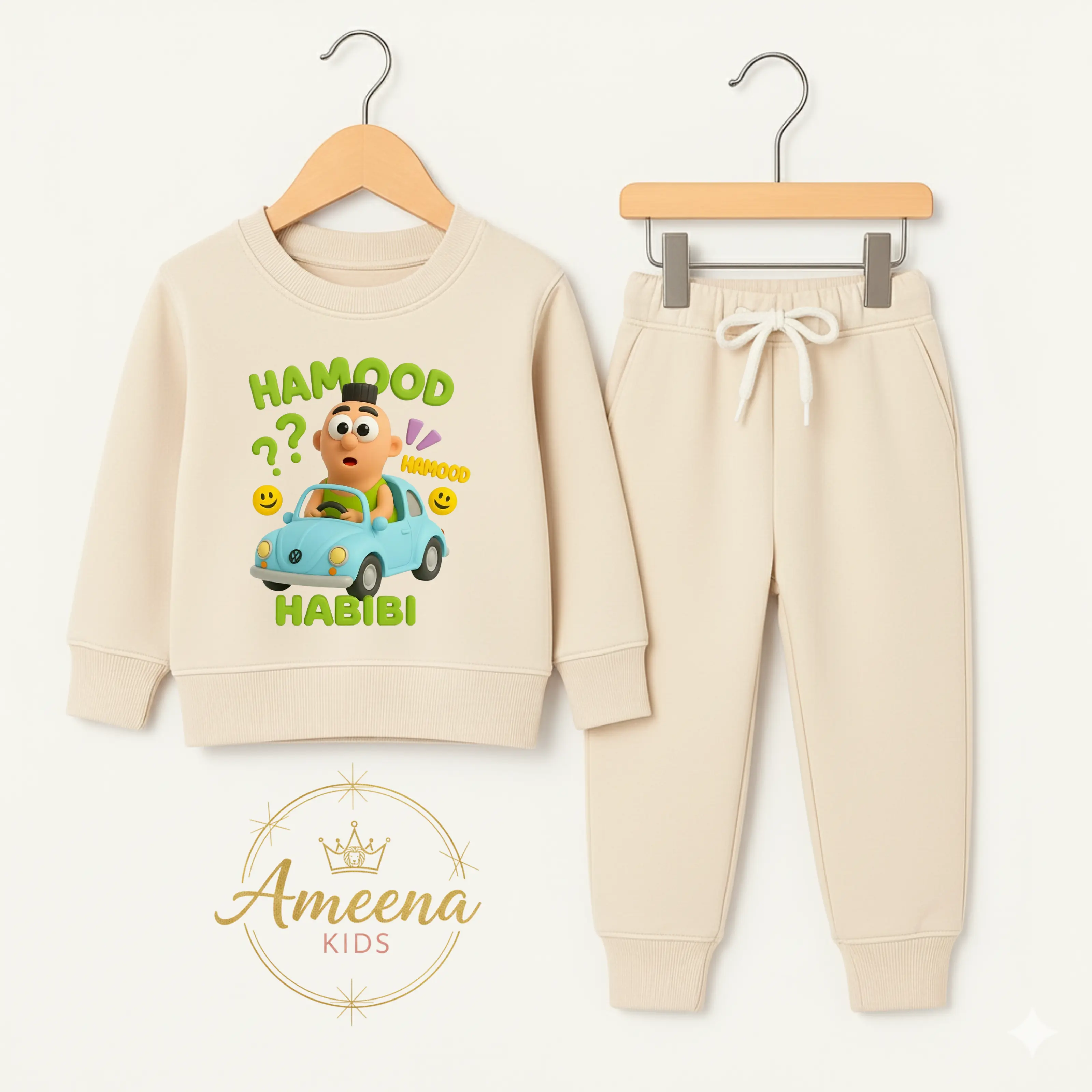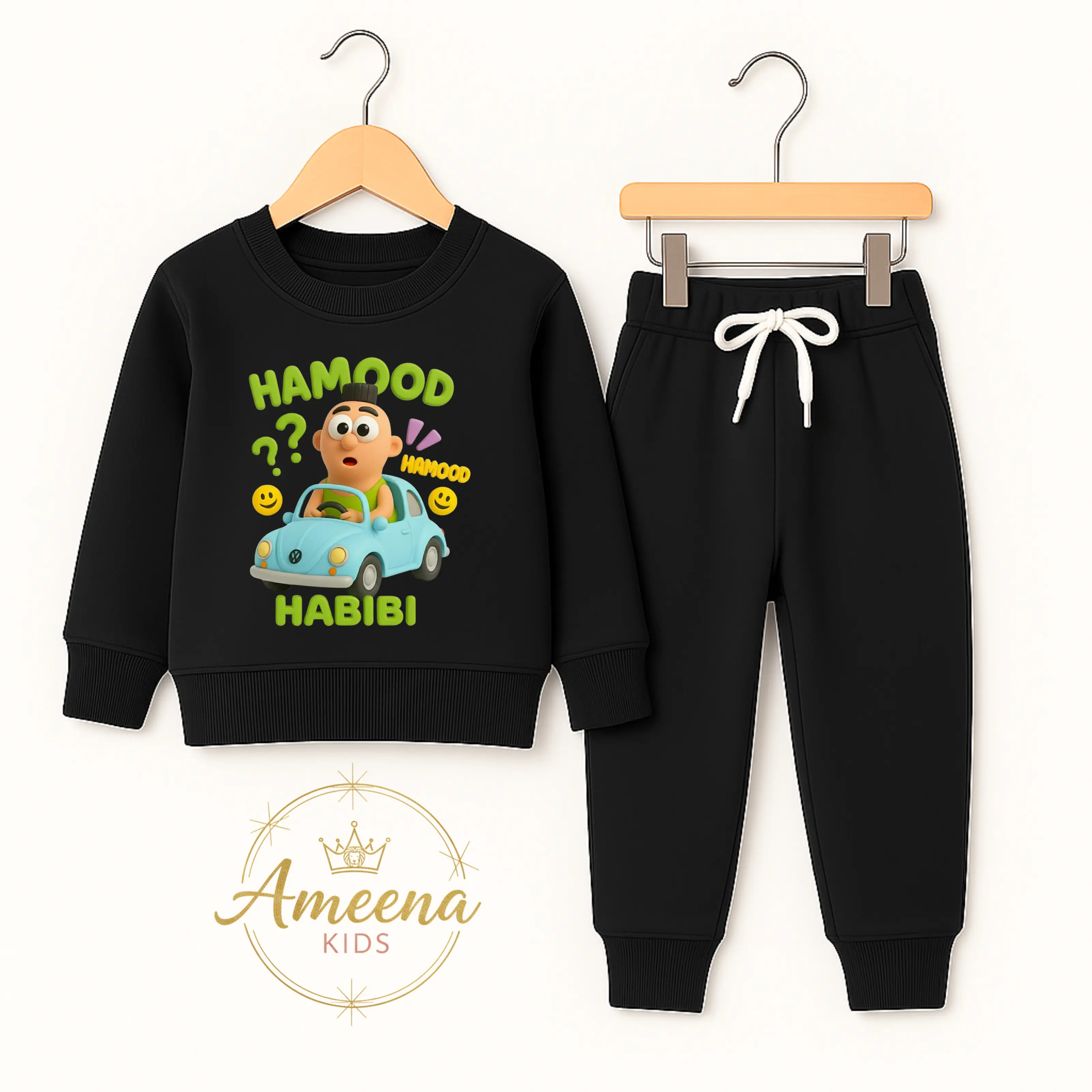 Ameena - Setelan Baju Anak Laki-laki & Perempuan Gambar Hamood Habibi. Setelan ini terdiri dari lengan panjang dan celana jogger karet pinggang. Dilengkapi dengan tali serut, setelan ini sangat nyaman untuk aktivitas sehari-hari. 🎃