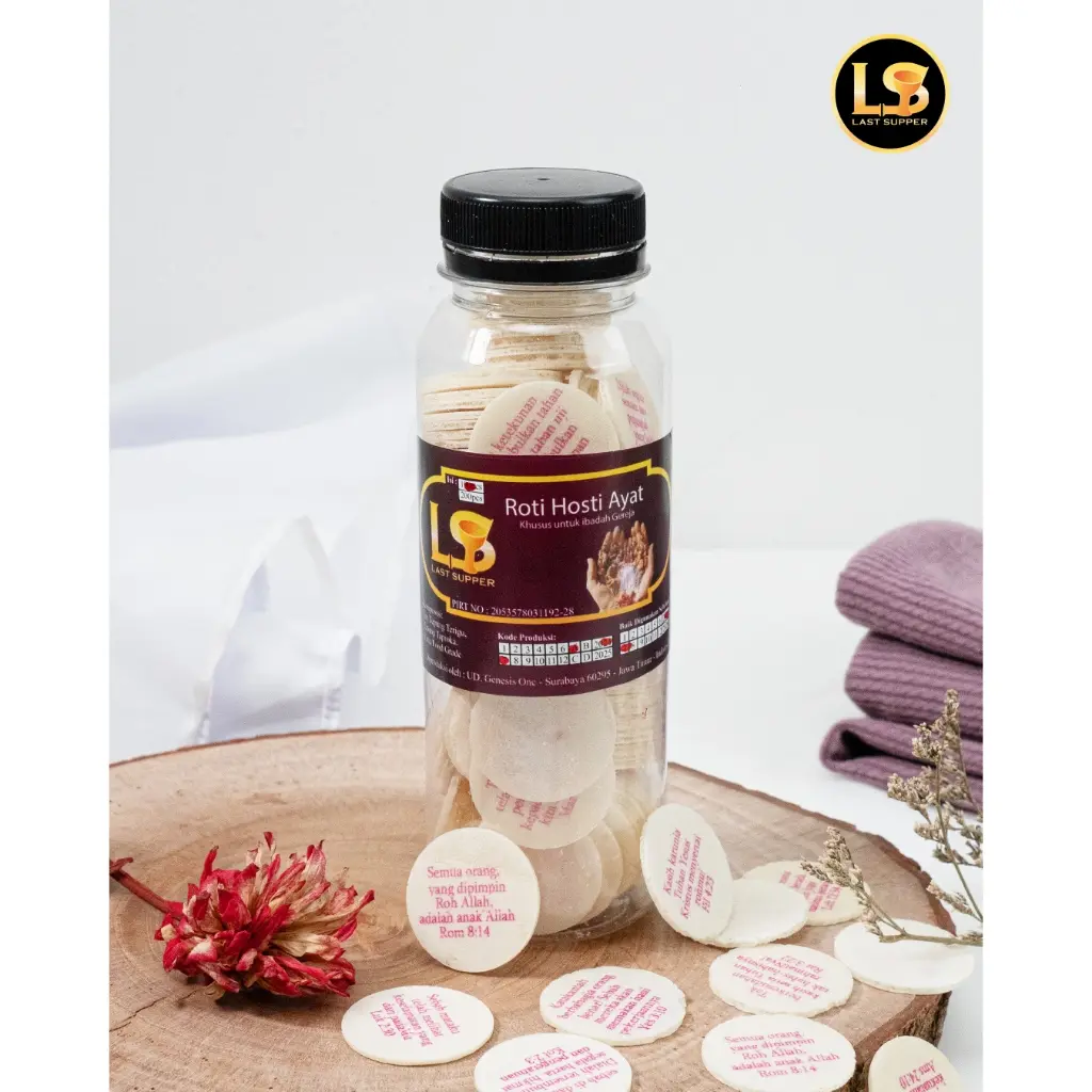 Hosti Ayat Last Supper (Botol isi 100 pcs) merupakan pilihan tepat untuk kebutuhan dalam menjalankan ibadah. Hosti ini hadir dalam bentuk bulat dengan diameter 3cm, sehingga mudah dikonsumsi dan dibagikan. Setiap kemasan berisi 100 pcs Hosti yang dikemas dalam cup, memastikan kualitas dan kebersihan tetap terjaga.