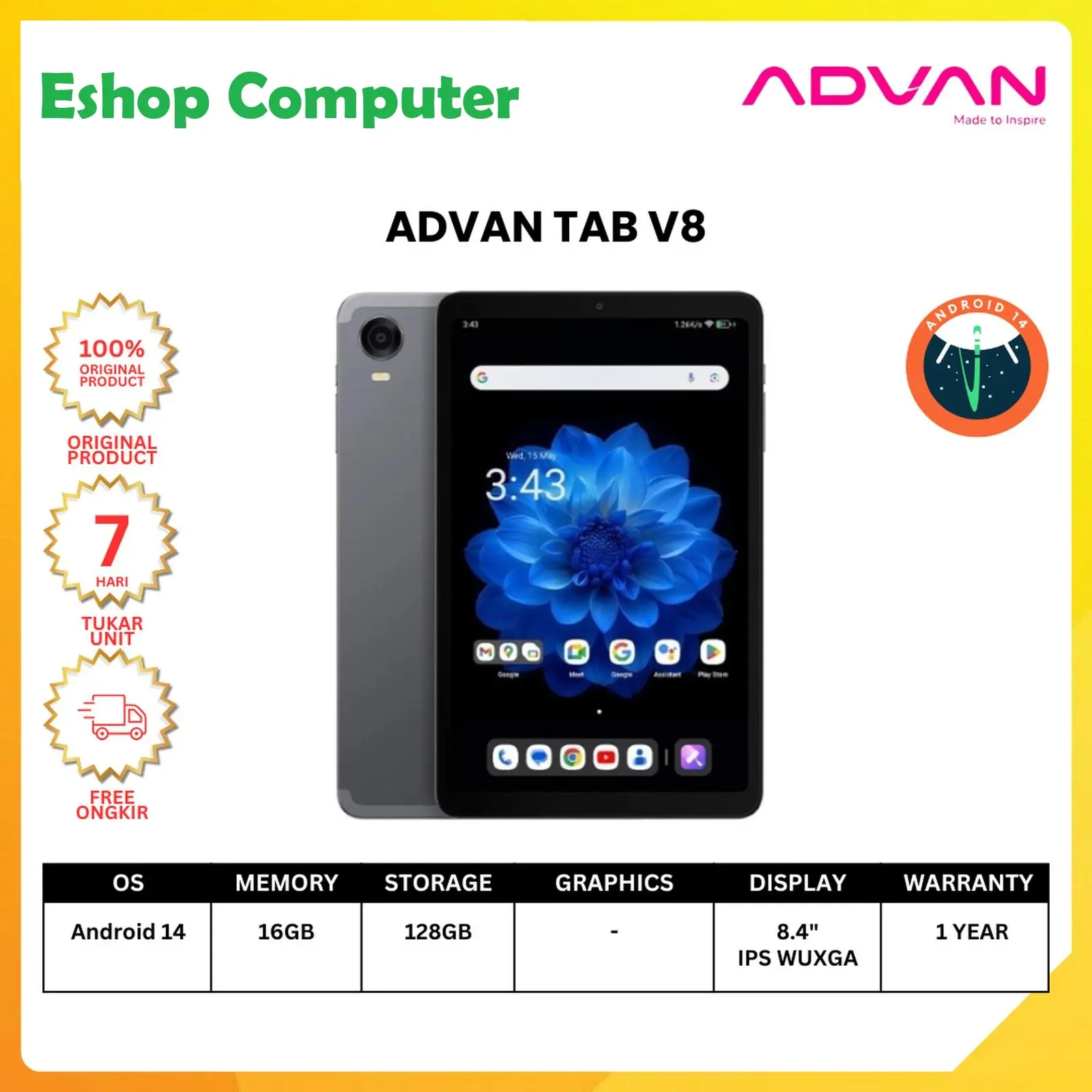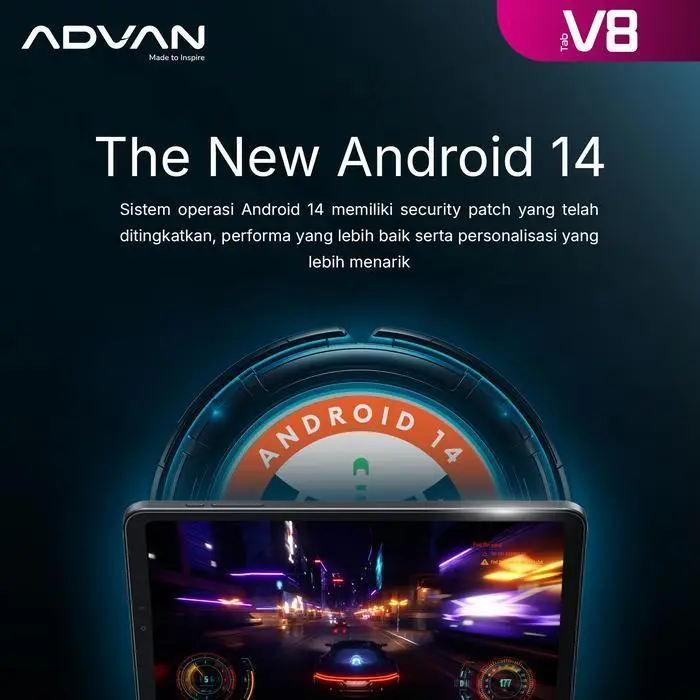ADVAN kembali hadir dengan produk terbaru TAB V8. Advan dengan bangga mempersembahkan Tablet terbaru dengan desain yang compact dan tipis. Tablet ini memiliki performa yang luar biasa dengan dukungan prosesor MEDIATEK HELIO G99. Advan Tab V8 siap untuk menemani kamu dalam bekerja, bermain, dan berkreasi. Jangan lewatkan kesempatan untuk merasakan kecanggihan inovasi baru dari Advan Tab V8.   Compact Design. Advan Tab A8 memiliki desain yang compact dan tipis. Desain dibuat semodern mungkin dengan mobilitas tiada dua, serta tanpa sedikitpun mengorbankan performa. Dimanapun pengguna berada, Advan Tab V8 menjadi teman setia yang andal dalam setiap aktivitas sehari-hari.   Unrivaled Resolution. Resolusi layar Tab V8 1920 x 1200 WUXGA FHD+. Dengan resolusi yang mumpuni memberikan kenyamanan dalam penggunaan layar saat streaming, gaming, dan lainnya.   Powerful Gaming Performance. Tab V8 ditenagai oleh prosesor Mediatek Helio G99. Performa Octa-core yang memberikan performa gaming luar biasa. Pengguna dapat merasakan kecepatan dan responsivitas tanpa batas dalam setiap permainan.   Bigger RAM. Advan Tab V8 dibekali dengan kapasitas RAM yang besar 8GB dan di dukung Virtual RAM 8GB, hingga memiliki total RAM 16GB. Multitasking menjadi lebih mudah dan performa selalu maksimal.   Big Storage Capacity. Dengan kapasitas penyimpanan yang besar 128GB, dan mendukung eksternal SD Card, Tab V8 memberikan kemudahan dan kenyamanan penyimpanan. Pengguna dapat menyimpan begitu banyak data tanpa perlu khawatir kehabisan ruang penyimpanan.   Rapid Charge Technology. Advan TAB V8 sudah menggunakan Type-C port charging dan sudah mendukung pengisian daya cepat. Dengan pengisian daya yang cepat dapat menghemat waktu pengguna.   Spesifikasi Operating System : Android 14 Dimension : 202.7 x 126 x 7.9 mm Network : GSM / HSPA / LTE Wifi : 802.11 b/g/n/ac (2.4GHz+5GHz) Bluetooth : 5.2 Port USB : Type C (support OTG) SIM Card : Dual Nano SIM card Display : 8.4 Inch 1200 x 1920 IPS WUXGA Chipset : Mediatek Helio G99 Memory : 8GB+8GB (Virtual RAM) Storage : 128GB Support SD Card : YES Speaker : dual stereo speakers Front Camera : 5MP FF Rear Camera : 13MP AF GPS : GPS+Beidou+Glonass+Galileo Gyroscope : YES Battery : Polymer 3.8V/5500mAh   Garansi Resmi 1 Tahun Advan Indonesia   Isi dalam kemasan : 1x Tab V8 1x Case 1x Kartu Garansi 1x Manual Book 1x Adaptor