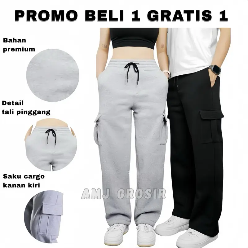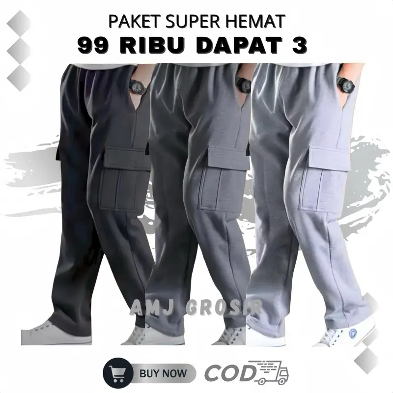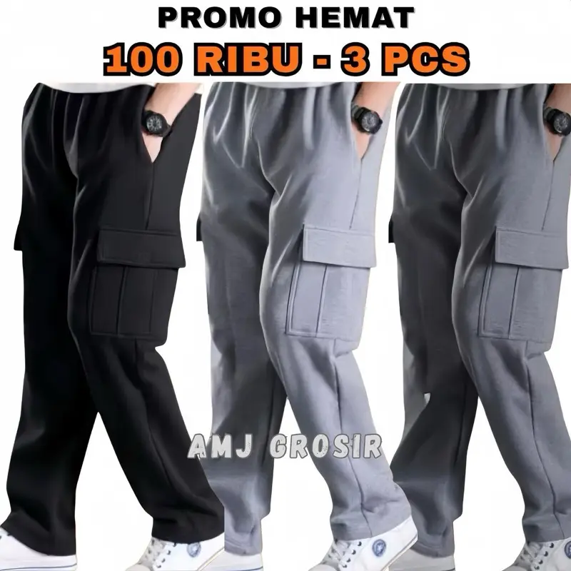 Dapatkan 3 celana panjang cargo babyterry hanya dengan 100 ribu. Bahan adem