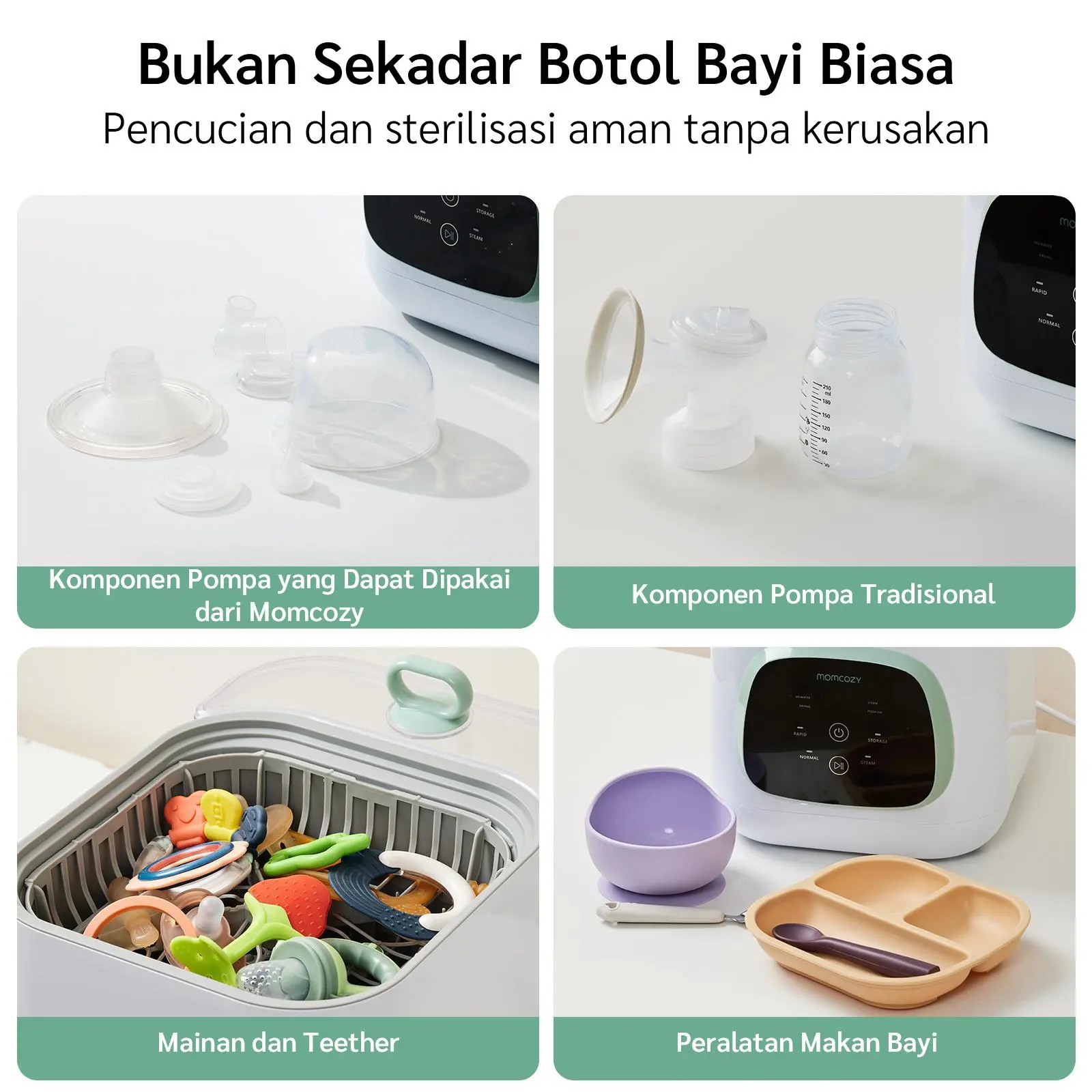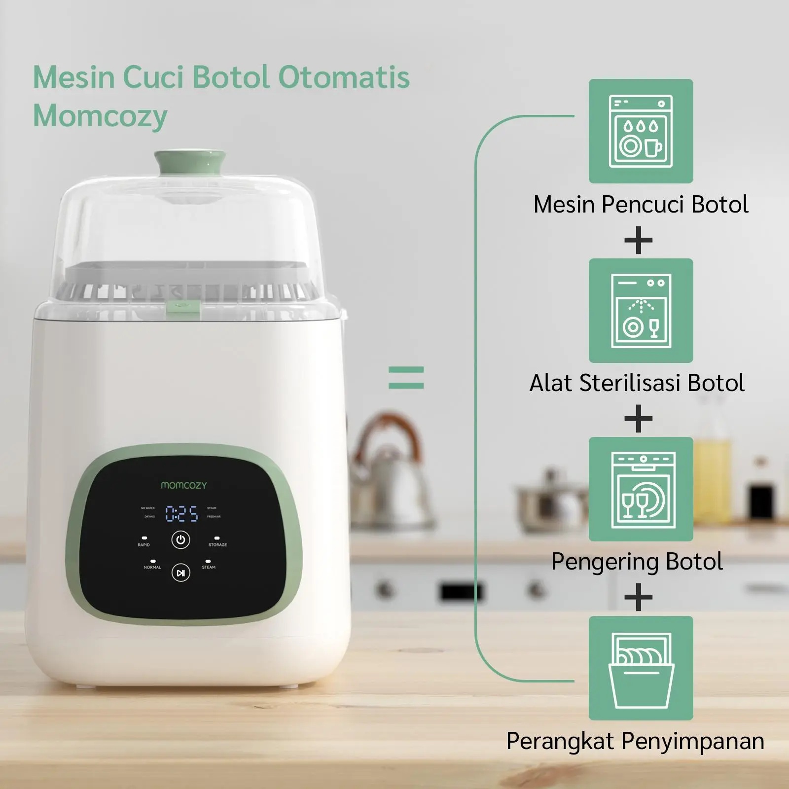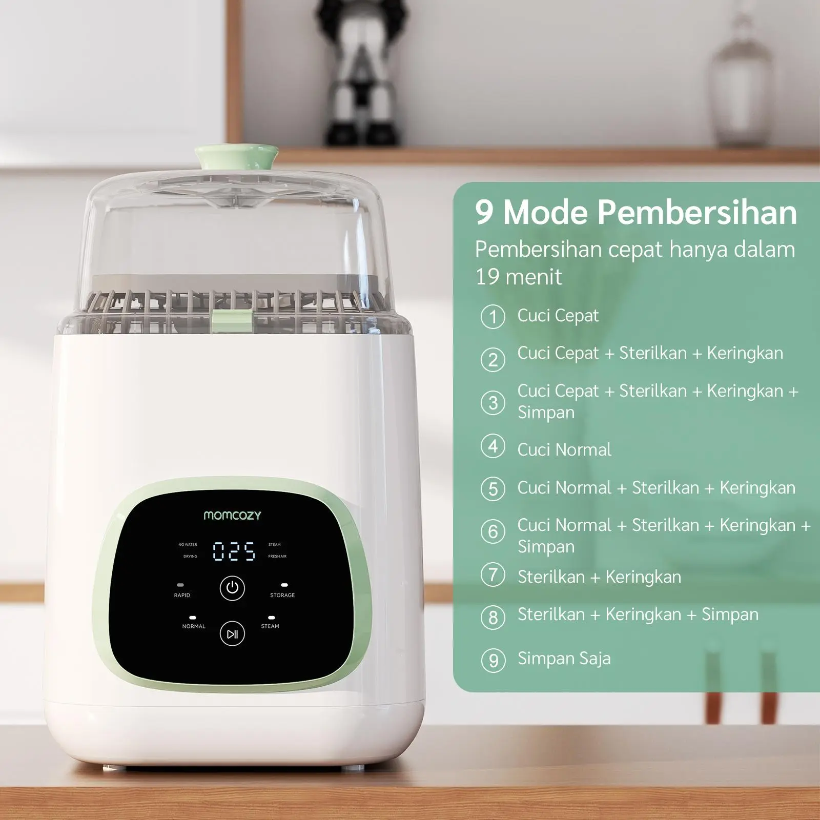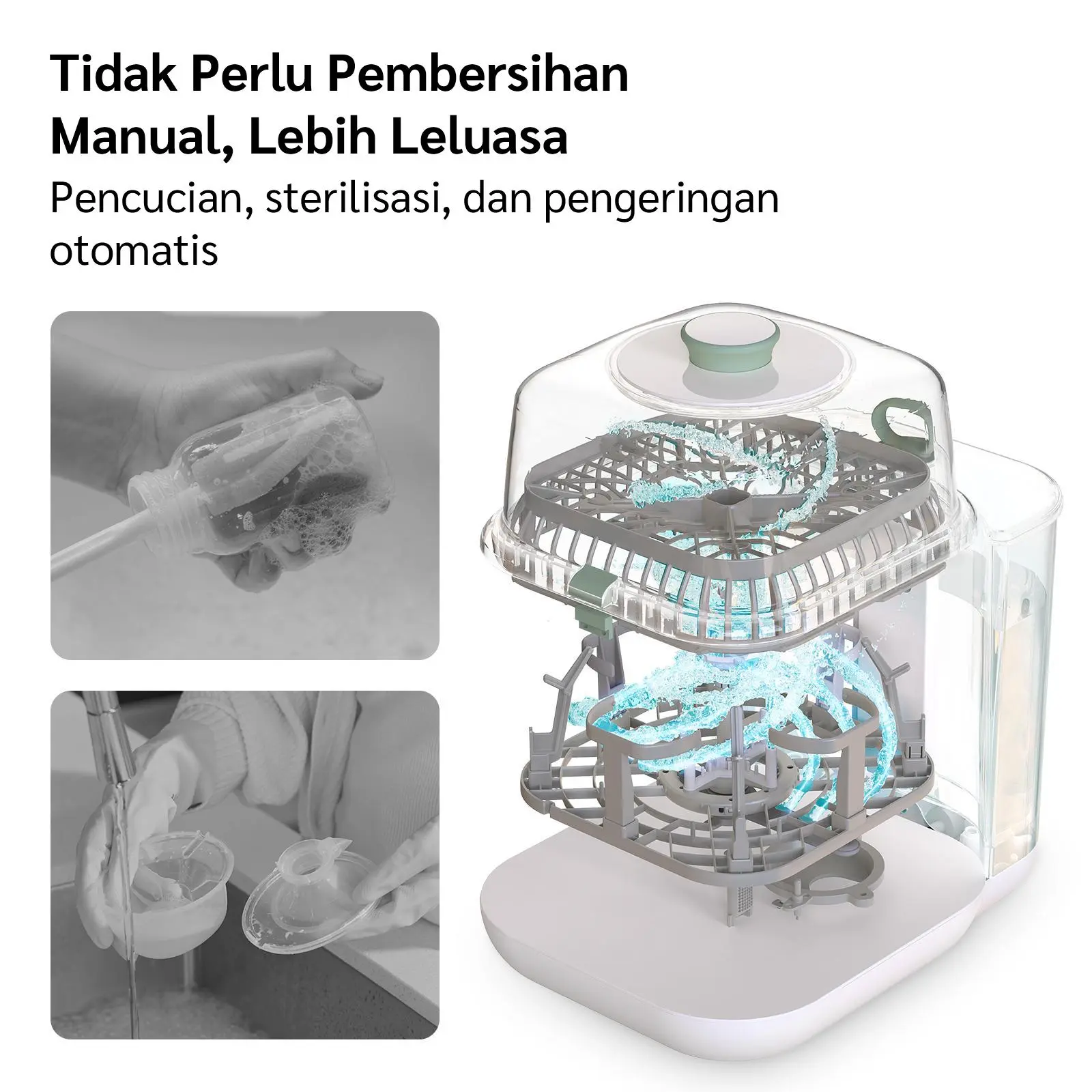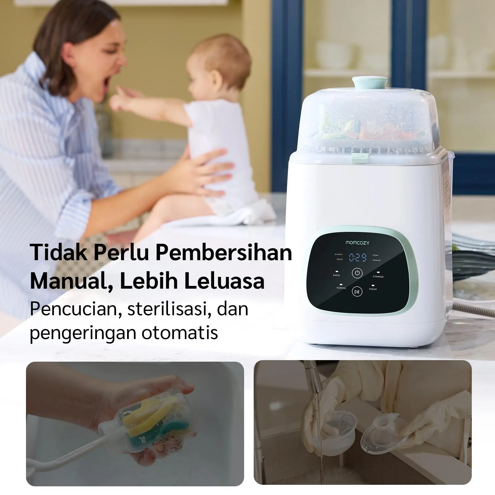 Program Otomatis 3-in-1 - Pembersihan menyeluruh + sterilisasi uap + pengeringan untuk botol dan aksesori. Menghemat waktu keluarga.