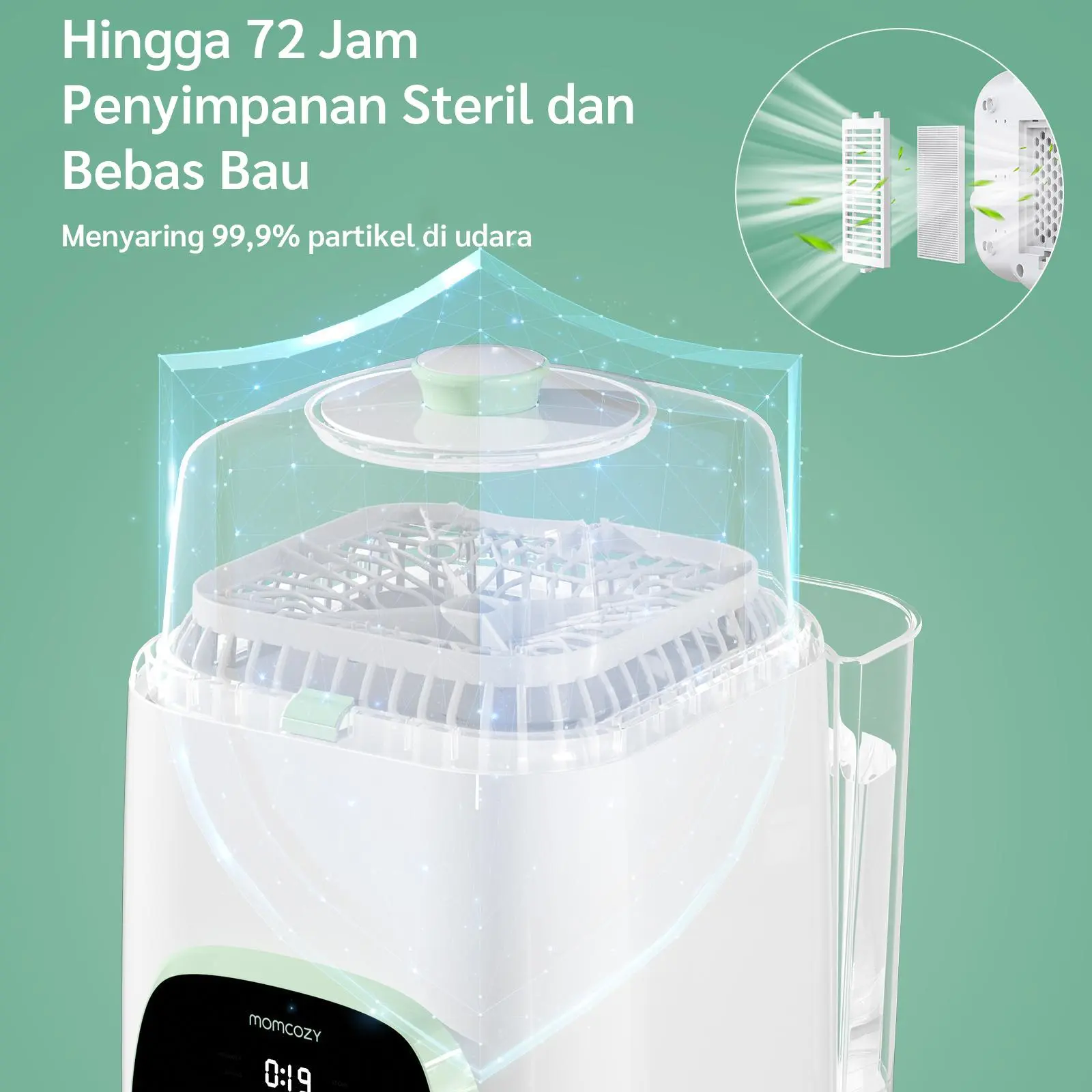 9 Program + Mode Ekspres - Pencucian cepat 19 menit dengan sterilisasi uap. Mode penyimpanan 72 jam untuk kebersihan yang tahan lama. Mesin Pencuci Botol Momcozy memberikan pengurangan partikel yang efektif dan menghilangkan 99,9% partikel.