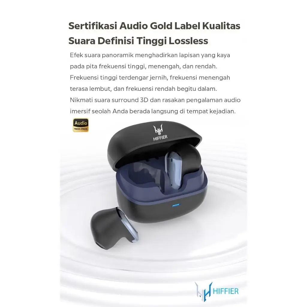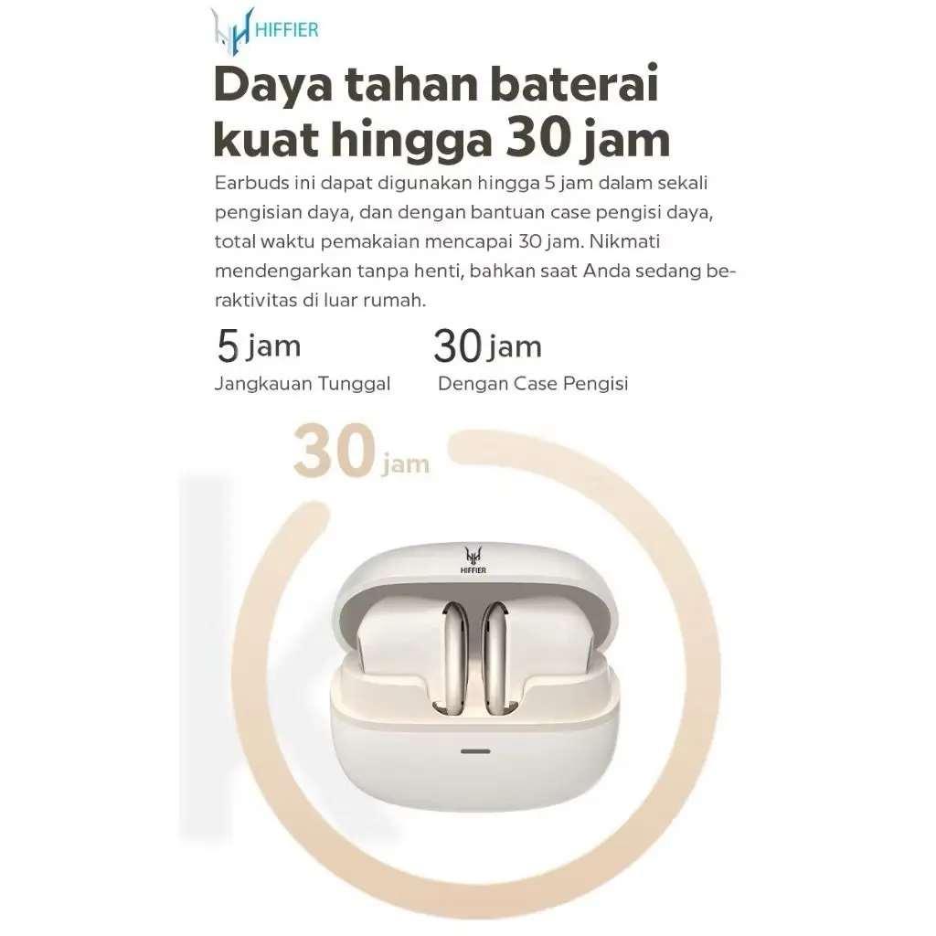 Mendukung Windows, iOS, dan Android. Cocok untuk kebanyakan perangkat nirkabel. Playtime sekitar 5 jam (20 jam dengan case pengisian).