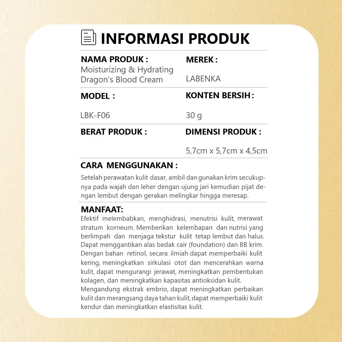 ·Krim Moisturizing dan Hydrating: LABENKA MOISTURIZING DAN HYDRATING DRAGON'S BLOOD CREAM LBK-F06 adalah krim yang dirancang untuk memberikan kelembapan dan hidrasi pada kulit. 🌿