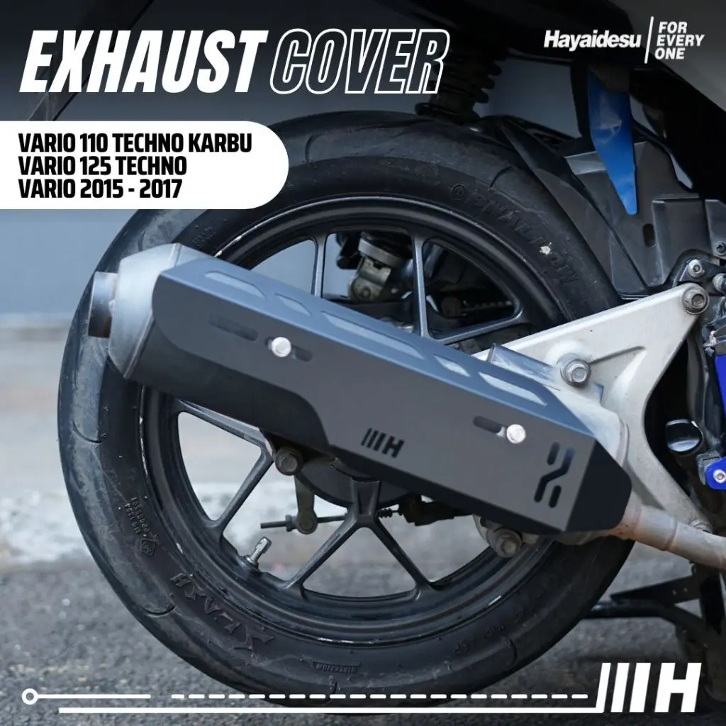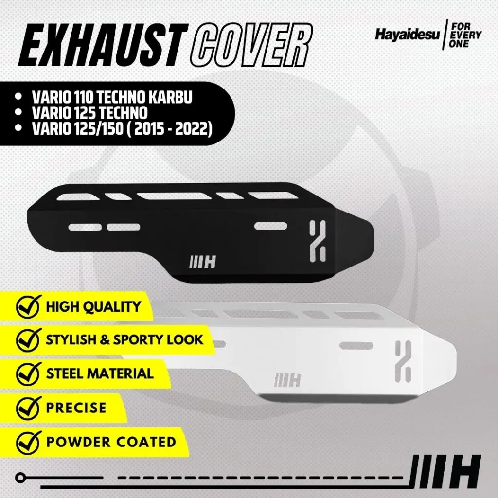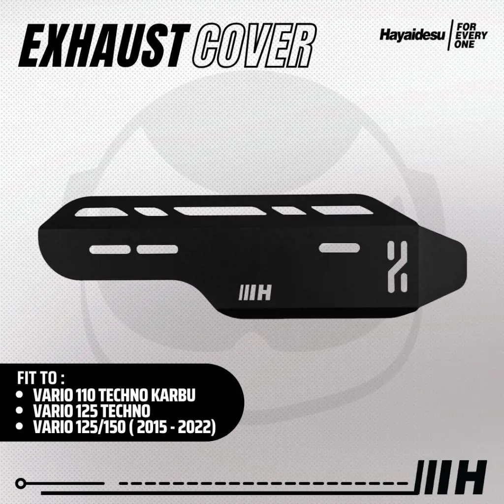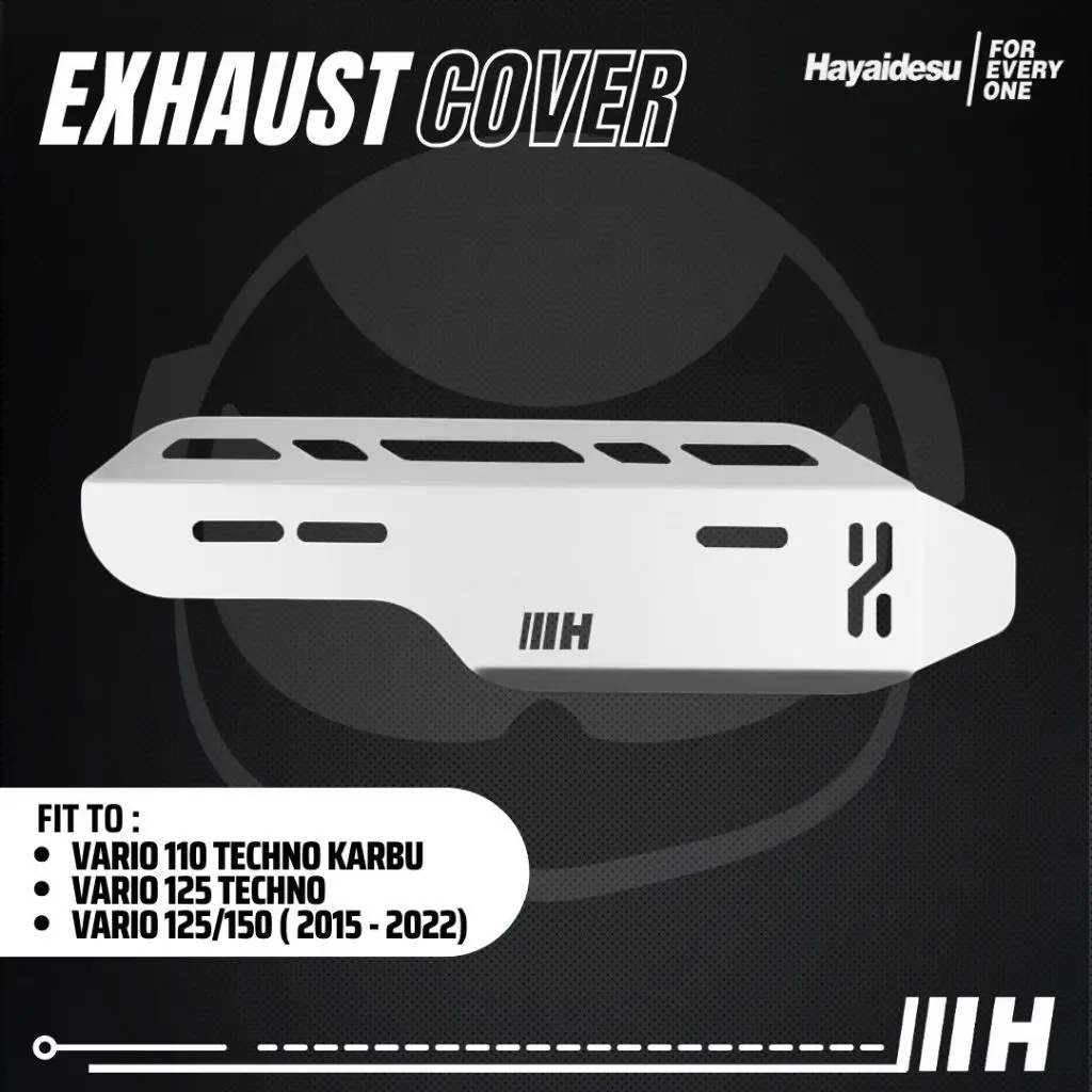Hayaidesu Exhaust Cover merupakan tameng pelindung knalpot motor yang terbuat dari besi yang di beri finishing warna dengan powder coating, berfungsi untuk melindungi knalpot dari gesekan dan benturan. Dibuat sebagai aksesoris pengganti tameng knalpot bawaan pabrik motor yang terbuat dari material plastik. Lebih kokoh, lebih gagah, dan lebih keren secara penampilan.