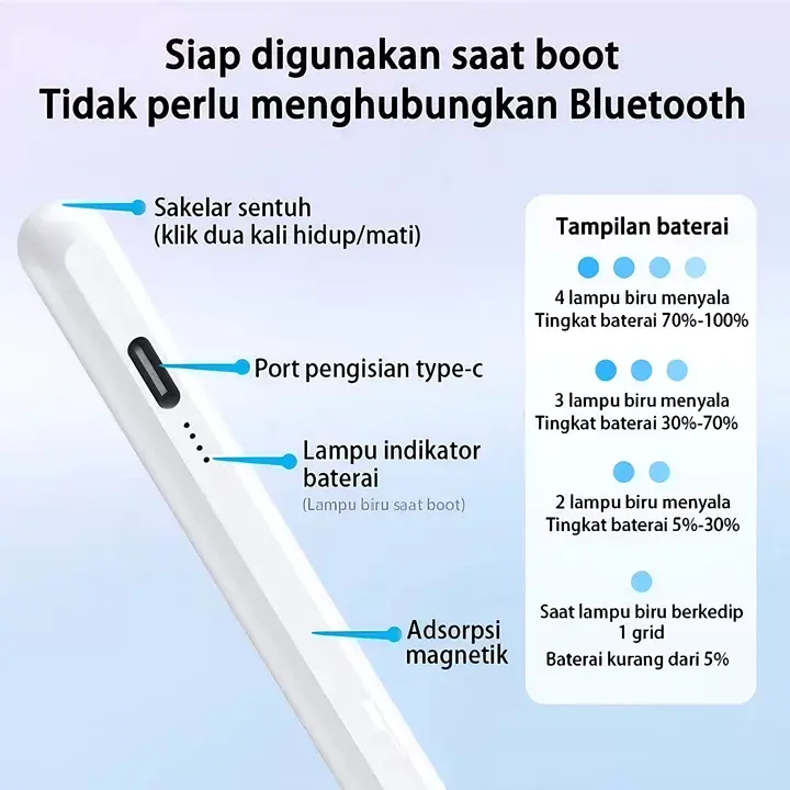 Dikirim dari Jakarta, Indonesia Pengiriman cepat biasanya 1 hari, rata-rata waktu tiba 3~5 hari! Periksa sebelum mengirim dan mengemas dengan aman. Produk ini mendukung matepad SE/11.5/11/10.4/air/pro dan model tablet Huawei lainnya sebelum membeli, Anda dapat bertanya kepada staf layanan pelanggan apakah cocok untuk tablet Anda. Stylus tablet ini tidak memerlukan Bluetooth atau aplikasi. Cukup sentuh tombol di penutup atas (lampu biru menyala) dan Anda dapat menggambar atau menulis di perangkat layar sentuh Anda. Stylus kami memungkinkan Anda menulis atau menggambar dengan mudah tanpa khawatir membuat kesalahan yang tidak perlu. Terasa seperti pena asli, sinyal lebih akurat, dan pengalaman menulis/menggambar lebih nyaman. ----------Deskripsi Produk---------- Nama: Pena kapasitif aktif Berlaku untuk: berbagai layar kapasitif Android dan Apple Tampilan battlerai: lampu indikator Daya pengisian antarmuka: Tipe-C Kapasitas baterai : 140mAh Waktu pengisian daya : 0,5 jam Waktu kerja : 8-10 jam Ukuran keseluruhan: 165x8.9mm (termasuk ujung pena) Ukuran ujung pena : 1,2 mm Status pengisian daya: Saat mengisi daya: lampu menyala, saat terisi penuh: keempat lampu menyala Jika tidak ada video unboxing, kami tidak dapat memproses atau memberikan kompensasi kepada Anda, terima kasih. tidak ada retur, tidak ada komplain Membeli = Setuju Jika Anda mempunyai pertanyaan atau kendala, Anda bisa langsung chat dengan customer service kami. Jika Anda puas, Anda dapat memberi kami peringkat bintang lima Terima kasih telah berbelanja di toko kami :)