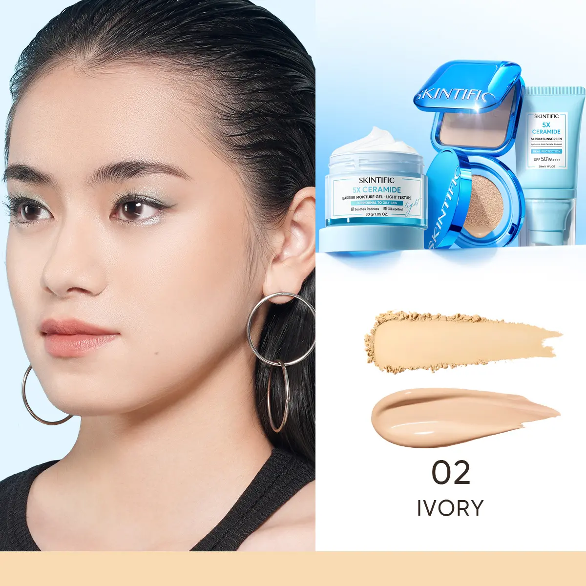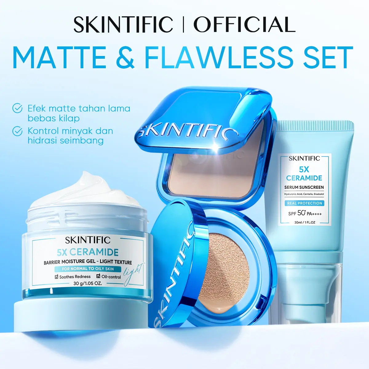 [Make Up 1 Set Lengkap] Skintific 4 Pcs Matte Cushion + 5X Ceramide Barrier Moisture Gel - Light Texture+5X Ceramide Serum Sunscreen+ Ultra Cover Powder Foundation | Makeup Sekaligus Skincare, Cocok Untuk Kulit Berminyak & Berjerawat