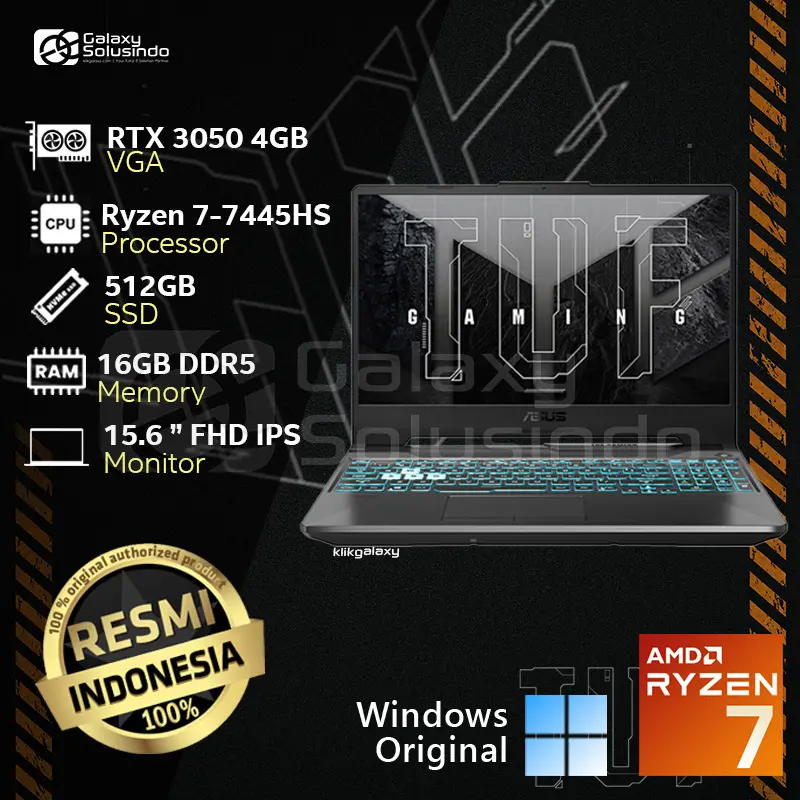 Processor : AMD Ryzen 7 7445HS Processor 3.2GHz (22MB Cache, up to 4.7GHz, 6 cores, 12 Threads) Display : 15.6-inch FHD (1920 x 1080) 16:9 144Hz Adaptive-Sync Value IPS-level 250nits 1000:1 62.5% sRGB Anti-glare display Memory : 16GB DDR5 SO-DIMM Storage : 512GB PCIe 4.0 NVMe M.2 SSD (2 Slot Include Used) Graphics : NVIDIA GeForce RTX 3050 Laptop GPU 4GB GDDR6 Keyboard : Backlit Chiclet Keyboard 1-Zone RGB Wireless : Wi-Fi 6(802.11ax) (Dual band) 2*2 + Bluetooth 5.3 Wireless Card (*Bluetooth version may change with OS version different.) Ports : 1x RJ45 LAN port; 1x USB 3.2 Gen 2 Type-C support DisplayPort; 3x USB 3.2 Gen 2 Type-A; 1x HDMI 2.0b; 1x 3.5mm Combo Audio Jack Speakers : 2-speaker system Camera : 720P HD camera Battery : 48WHrs, 3S1P, 3-cell Li-ion 150W AC Adapter OS : Windows 11 Home + Office Home 2024 + Free 1 Year Trial Microsoft 365 Basic