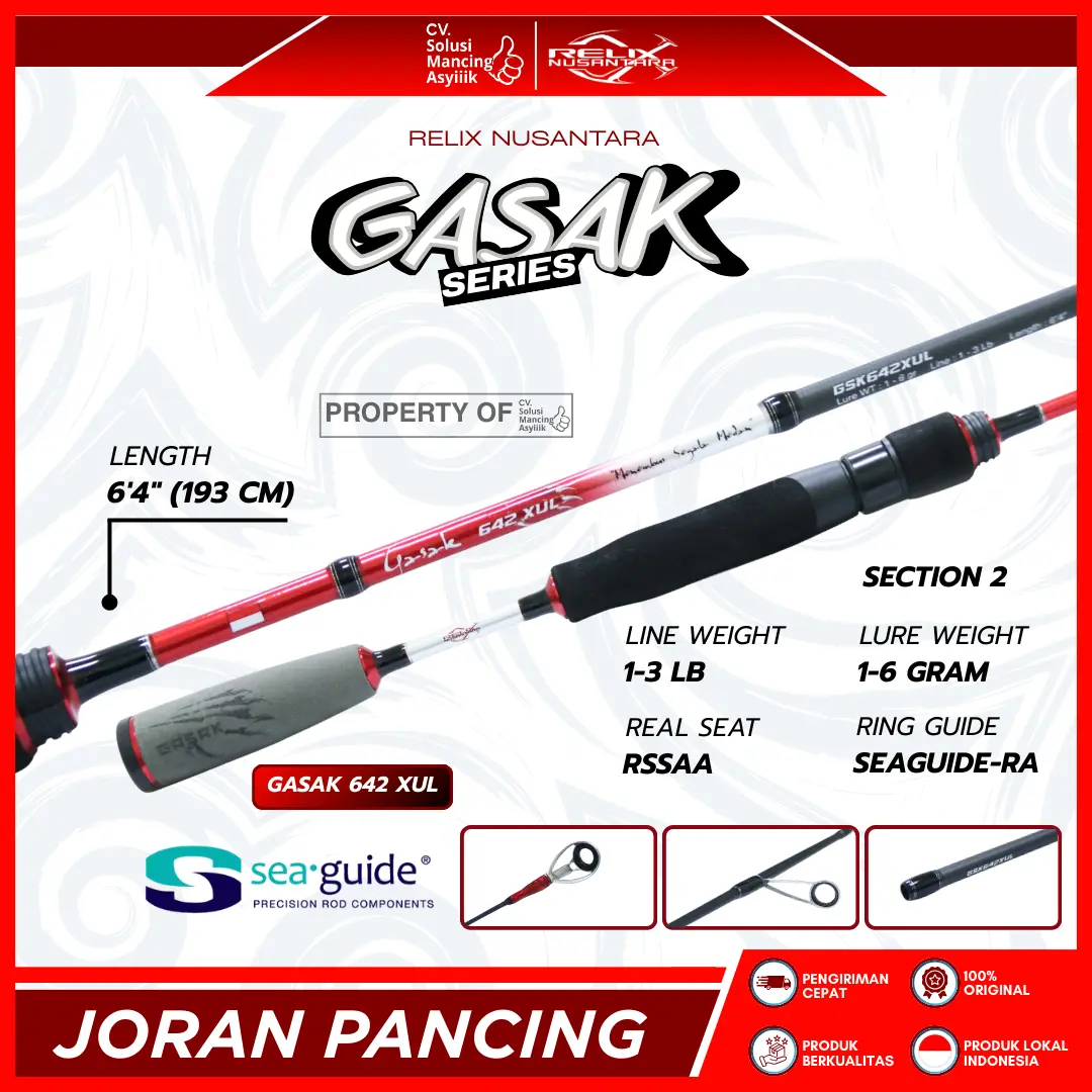 Relix Nusantara GASAK SERIES adalah joran spinning yang didesain khusus bagi penggemar teknik Ultralight (UL) dan Extra Ultralight (XUL). Joran ini menawarkan sensasi mancing yang luar biasa, di mana pertarungan dengan ikan kecil pun terasa epik. Dibuat dari material Carbon berkualitas, joran ini sangat ringan, responsif, dan mampu melempar umpan-umpan mikro dengan akurasi tinggi.
