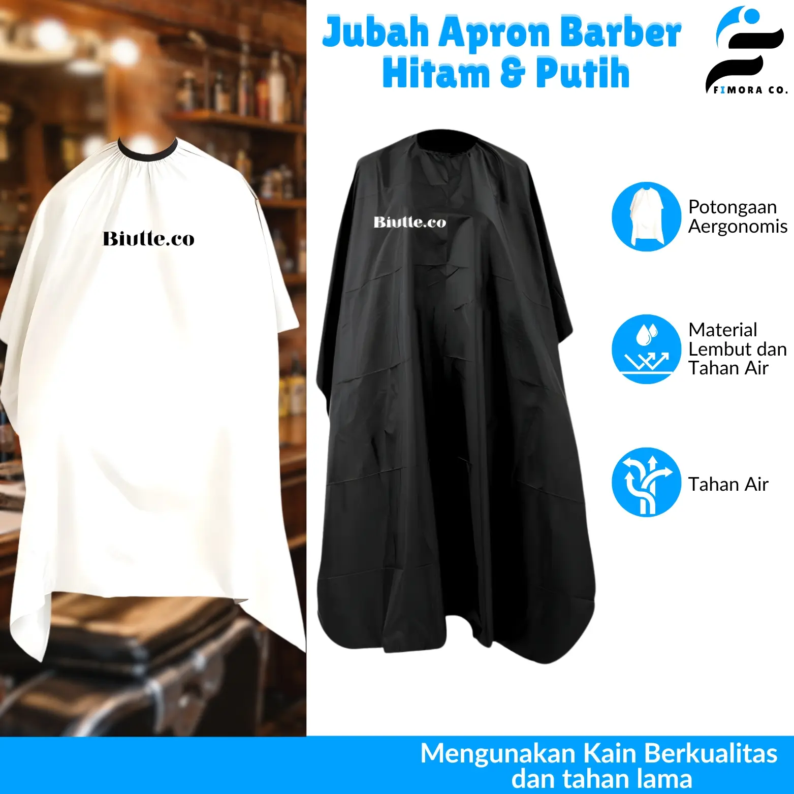 Kini apron haruslah keren untuk menunjang tampilan pelanggan saat potong rambut. Itulah mengapa jubah apron dari Biutte.co ini menghadirkan desain simpel dan modern ala profesional. Apron yang bergaya dapat menjadi daya tarik lebih bagi barbershop Anda.