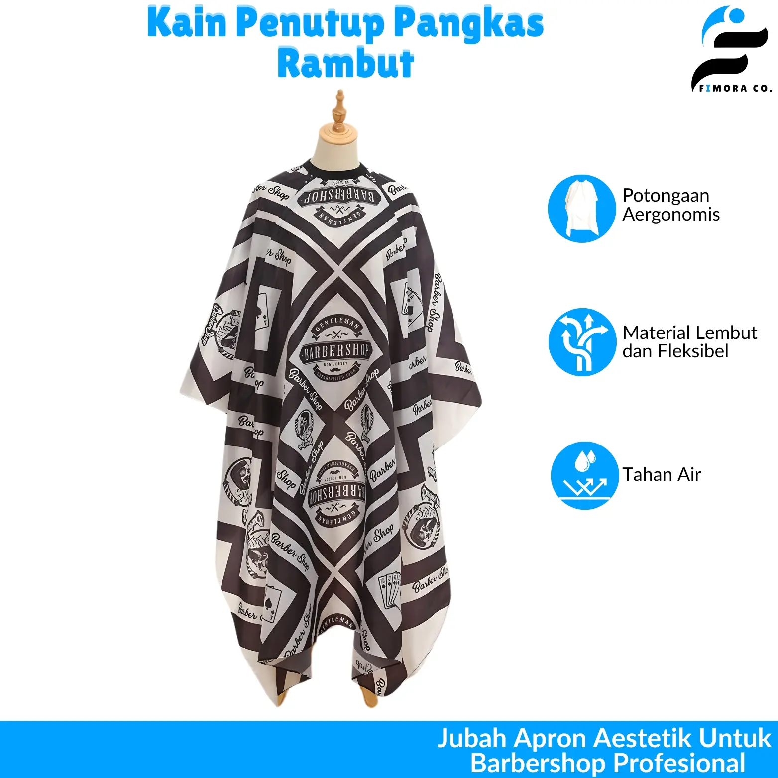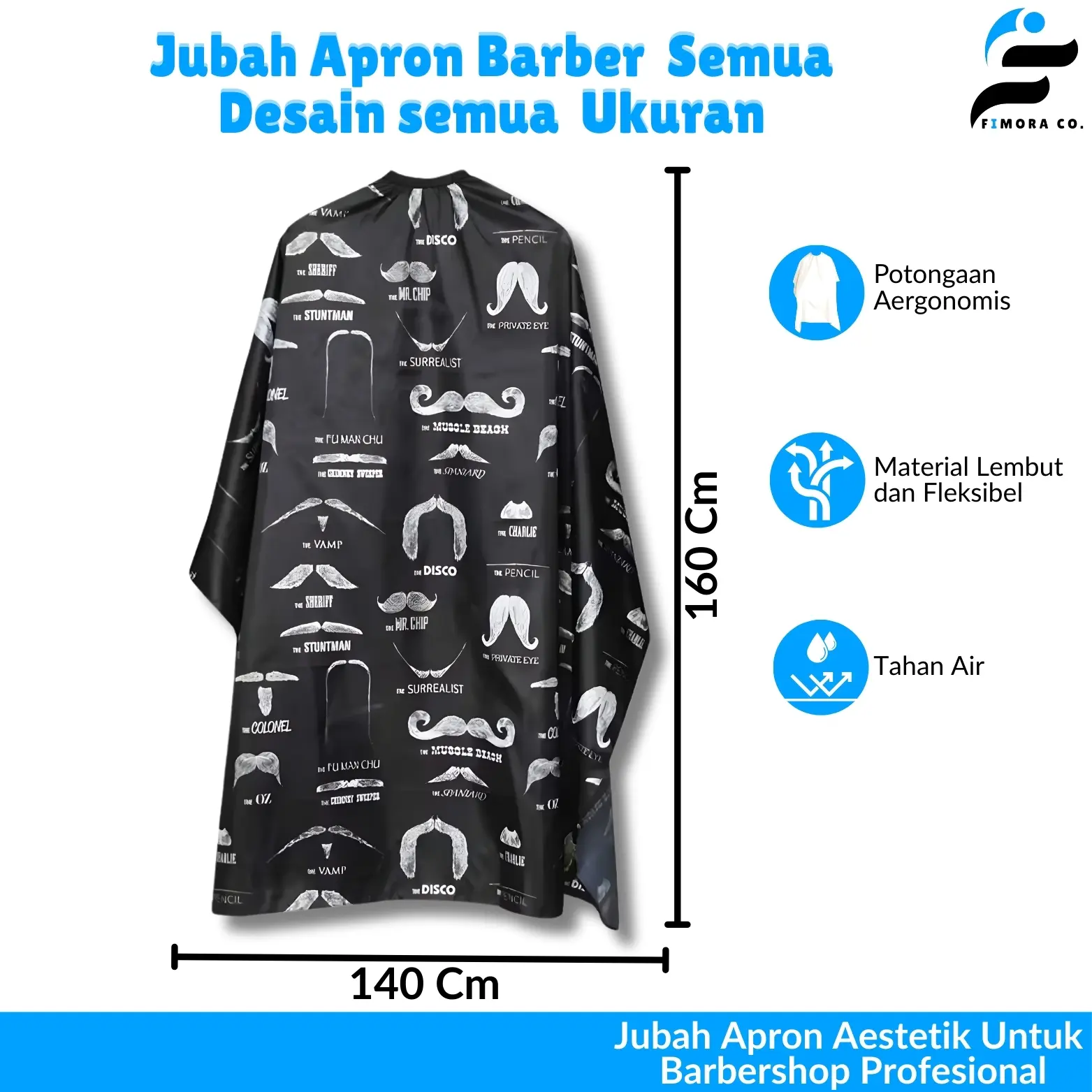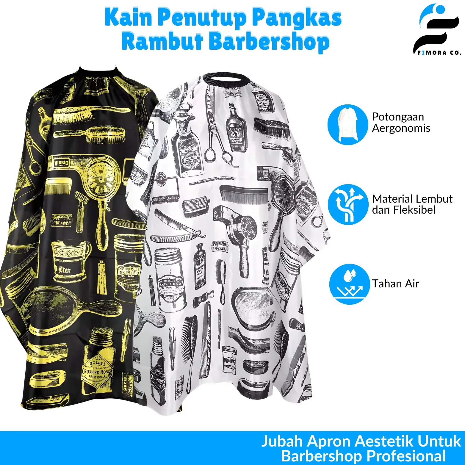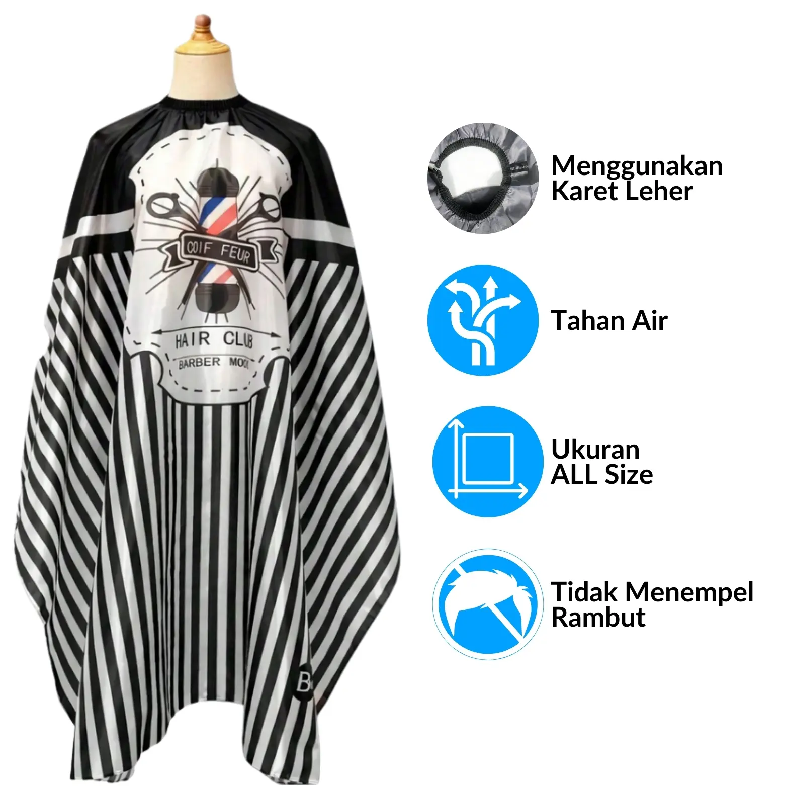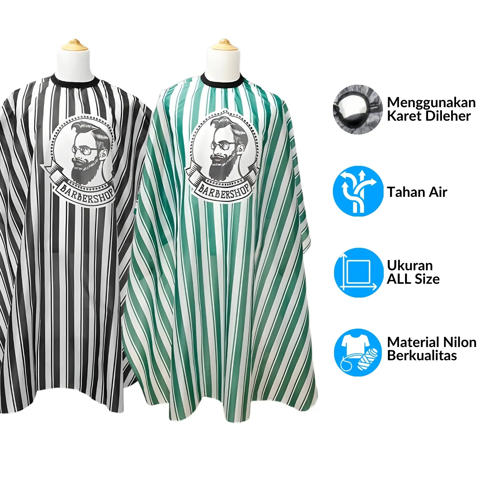 Untuk menghadirkan proses potong rambut yang bersih dan nyaman, Anda membutuhkan jubah apron. Ukurannya cukup lebar untuk melindungi pakaian secara keseluruhan. Agar tidak ada celah yang tersisa, bagian kerah lehernya dibekali karet dan pengait. Materialnya bahkan dirancang tahan air untuk mendukung penggunaan spray rambut. Tak ketinggalan modelnya yang modern ala profesional sehingga cocok digunakan di salon atau barbershop.