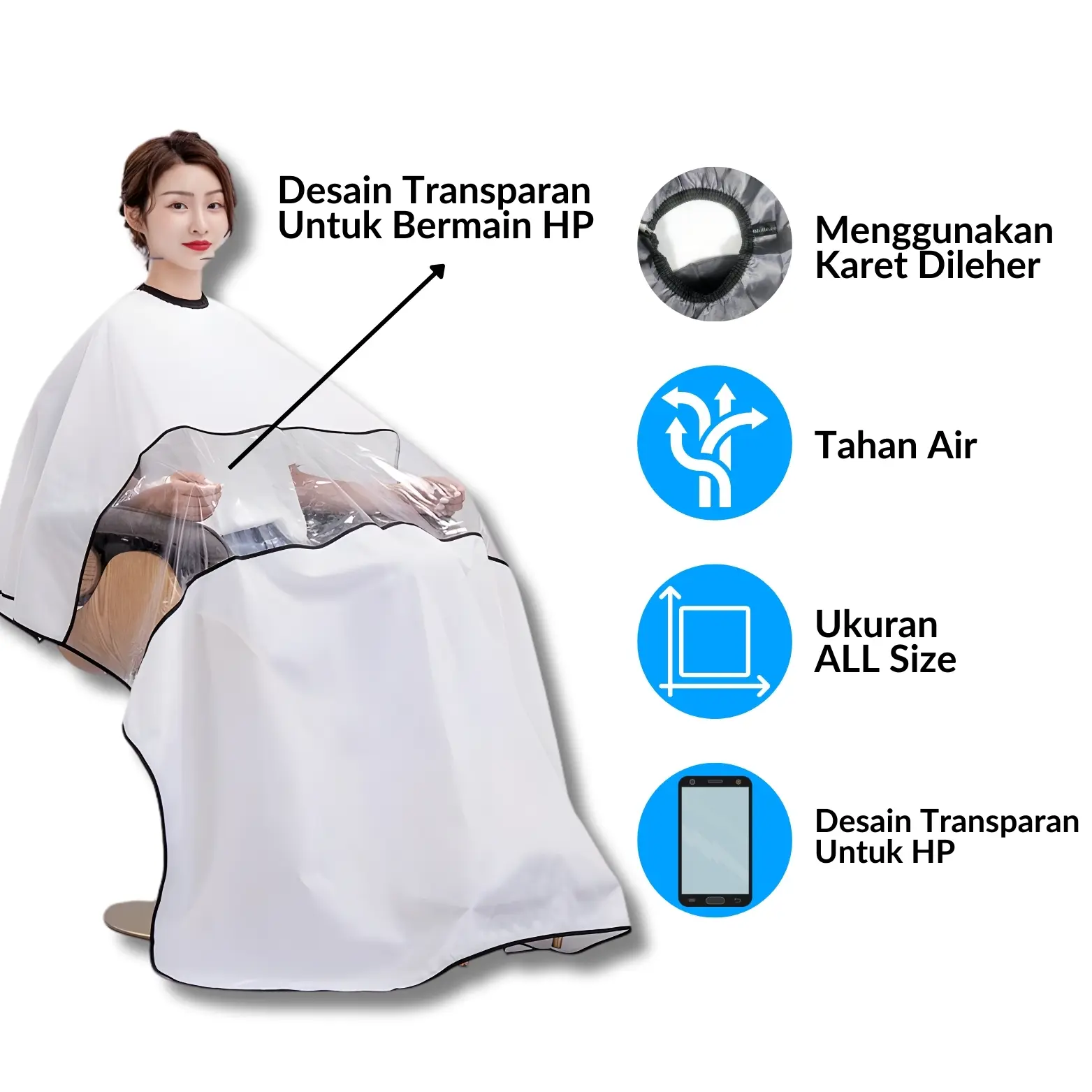 Anda dapat menggunakan spray rambut dengan leluasa tanpa khawatir membasahi pakaian pelanggan. Jubah apron potong rambut ini mampu menahan cipratan air agar tidak tembus ke dalam. Pakaian pun akan tetap kering dan bersih.
