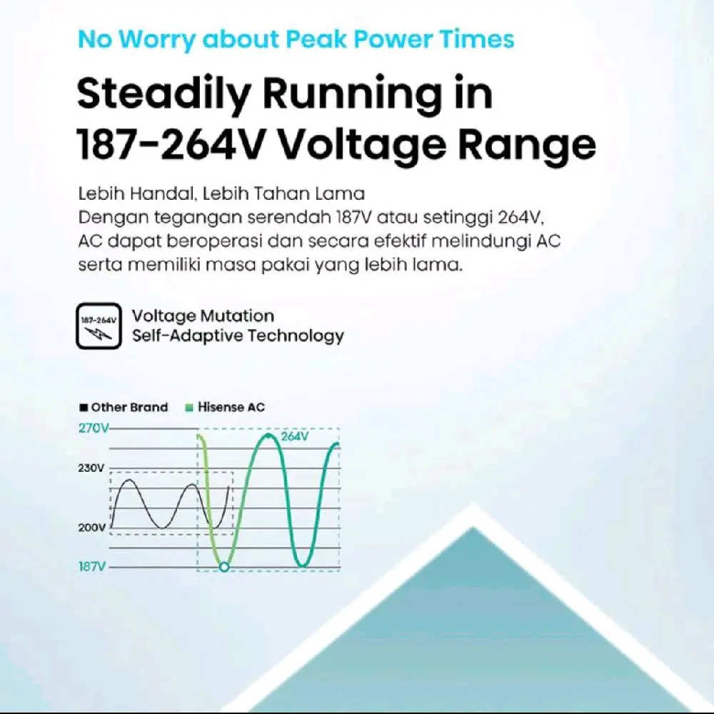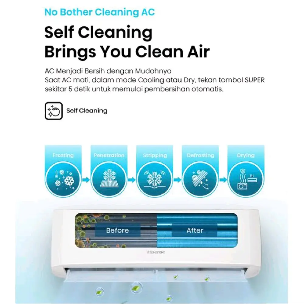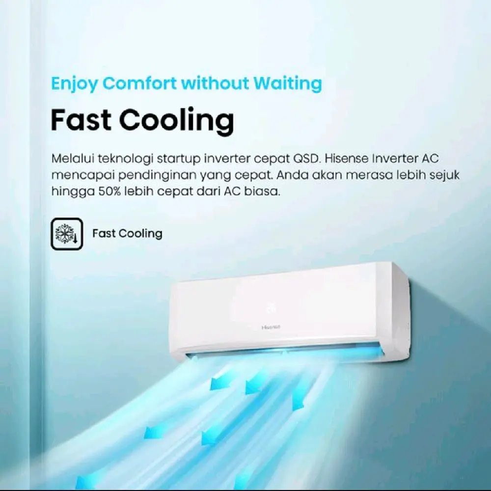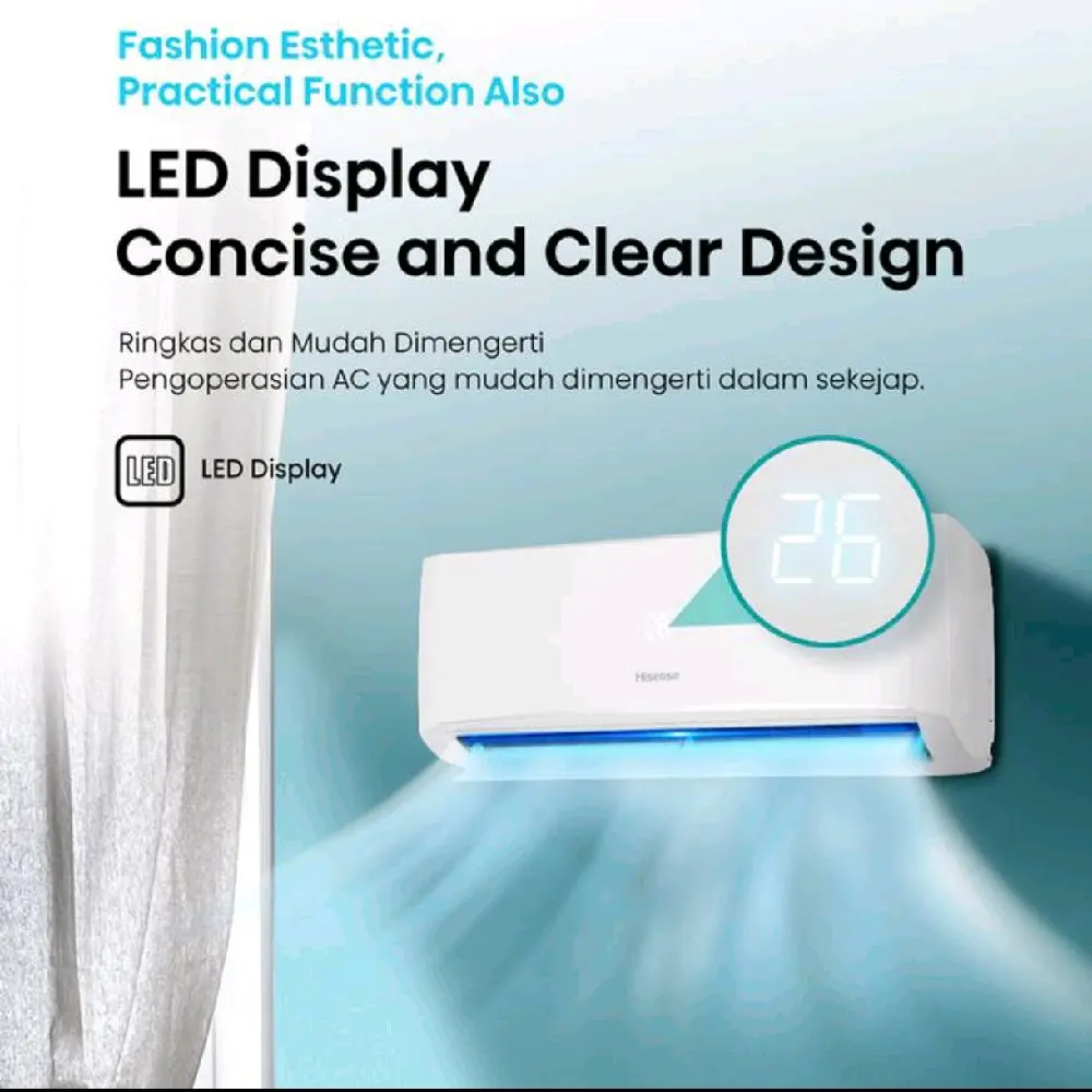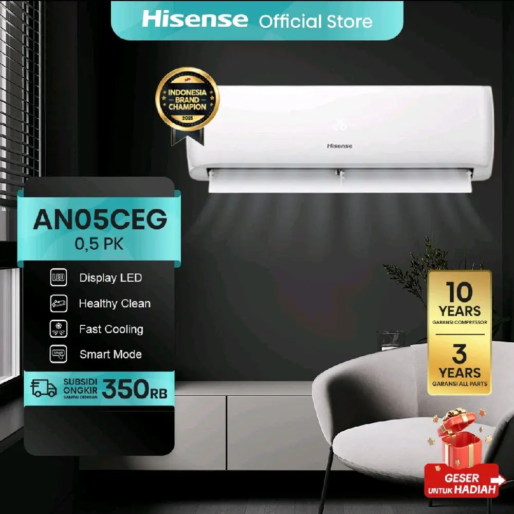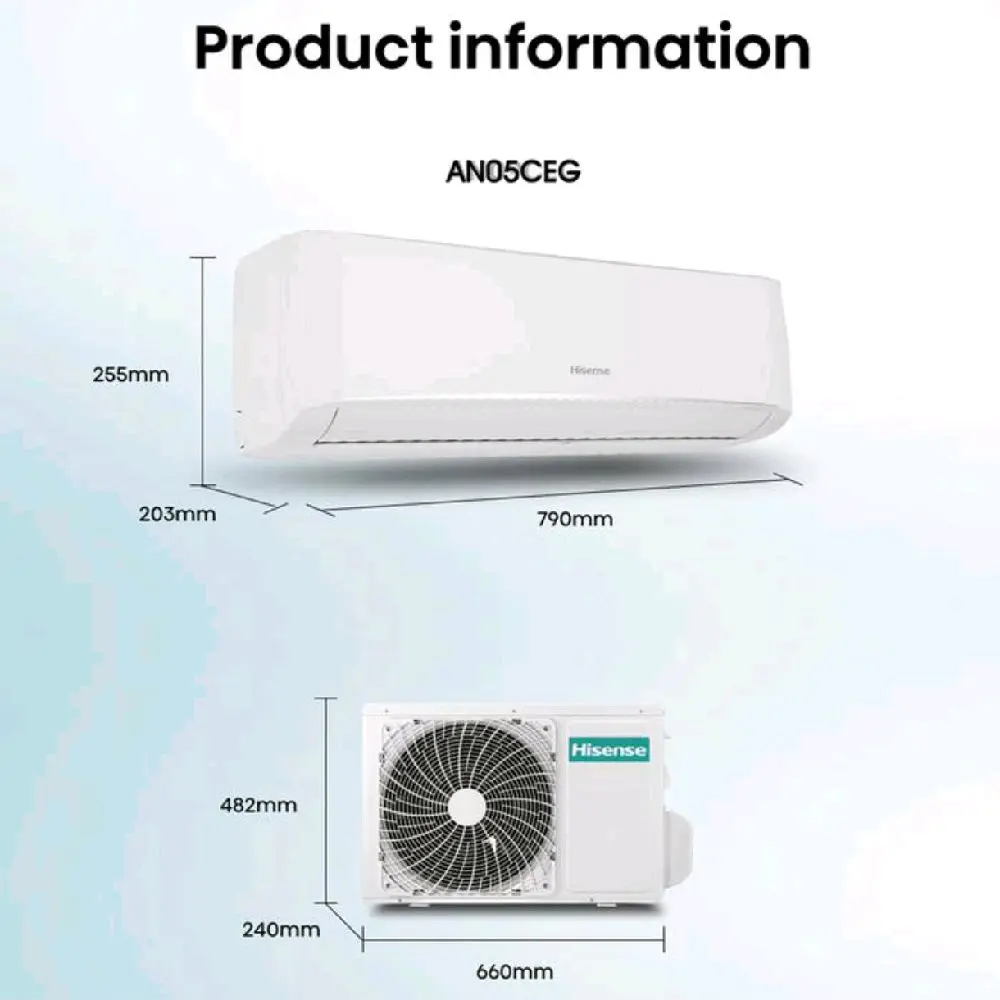 Merek: Hisense, Model: AN05CEG. AC ini memiliki daya suplay 220-240V, 1Ph,