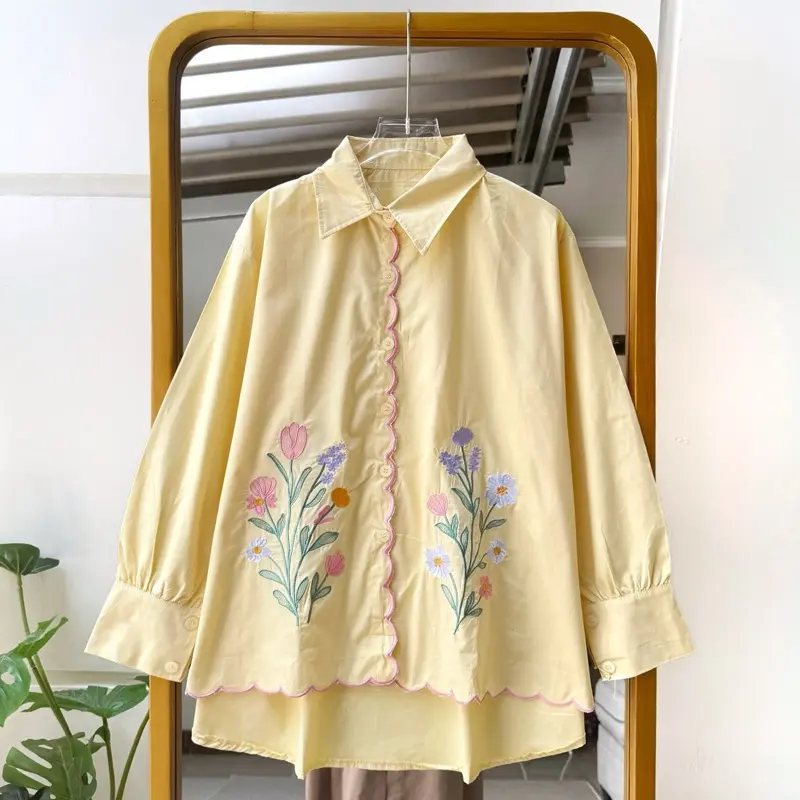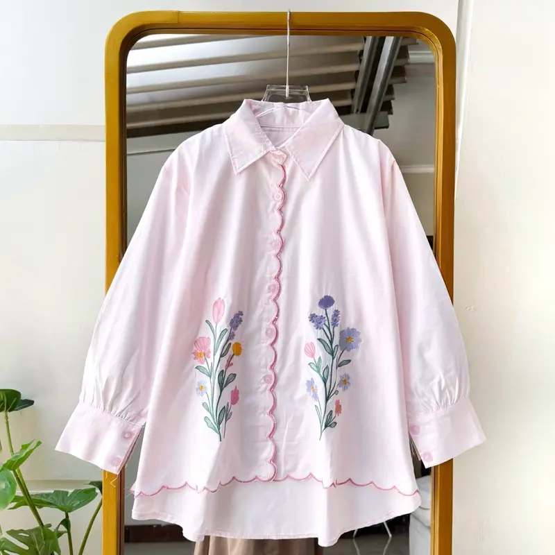 Velora Embroidery Shirt – Kemeja Bordir Bunga Lengan Panjang Wanita Korean Look