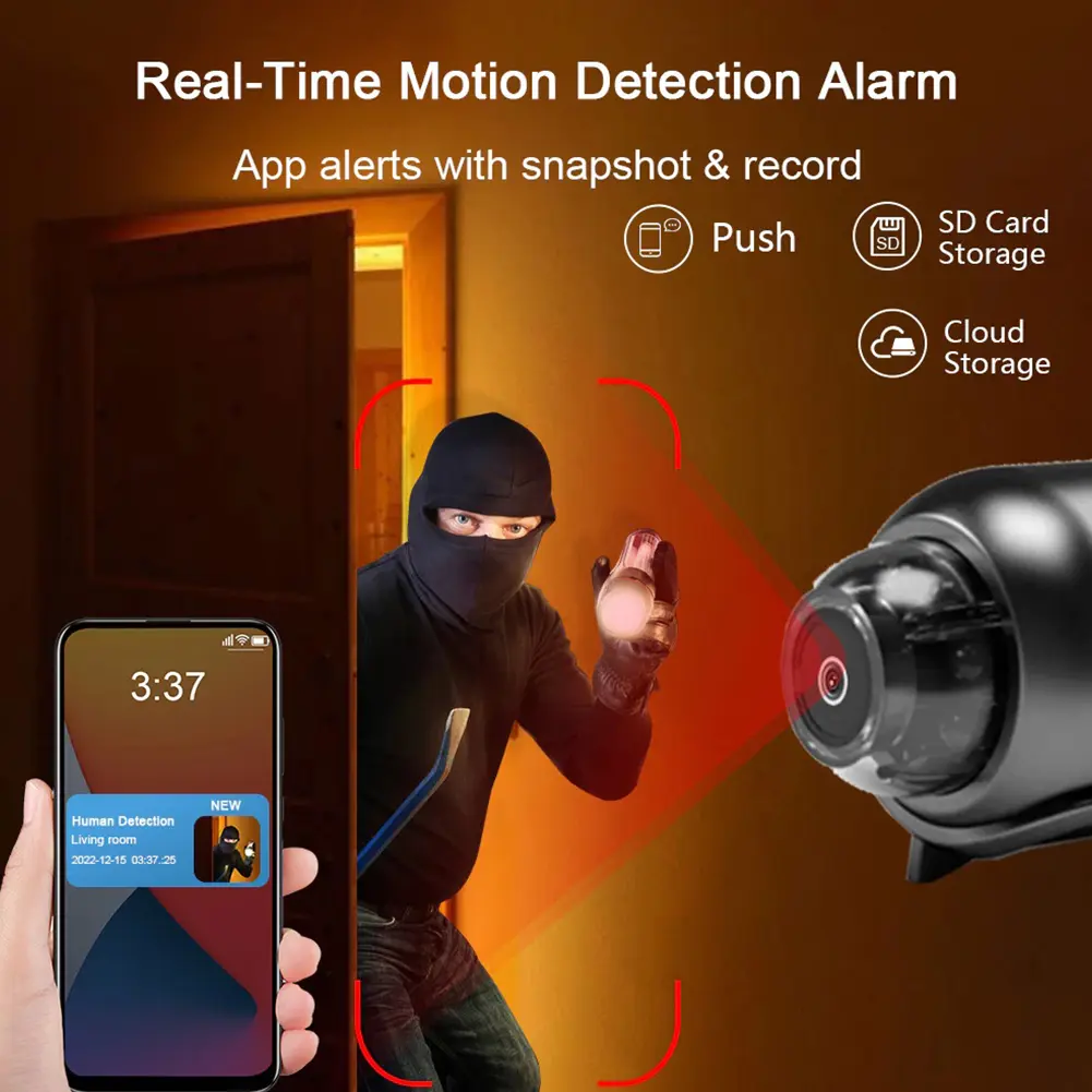 【Mudah dipasang】 Menampilkan desain yang bijaksana, kamera keamanan mini ini mudah dipasang dan dapat dipasang di sudut tanpa menarik perhatian. Pickup bawaan untuk merekam video serta kualitas suara ambient jelas tanpa kebisingan.